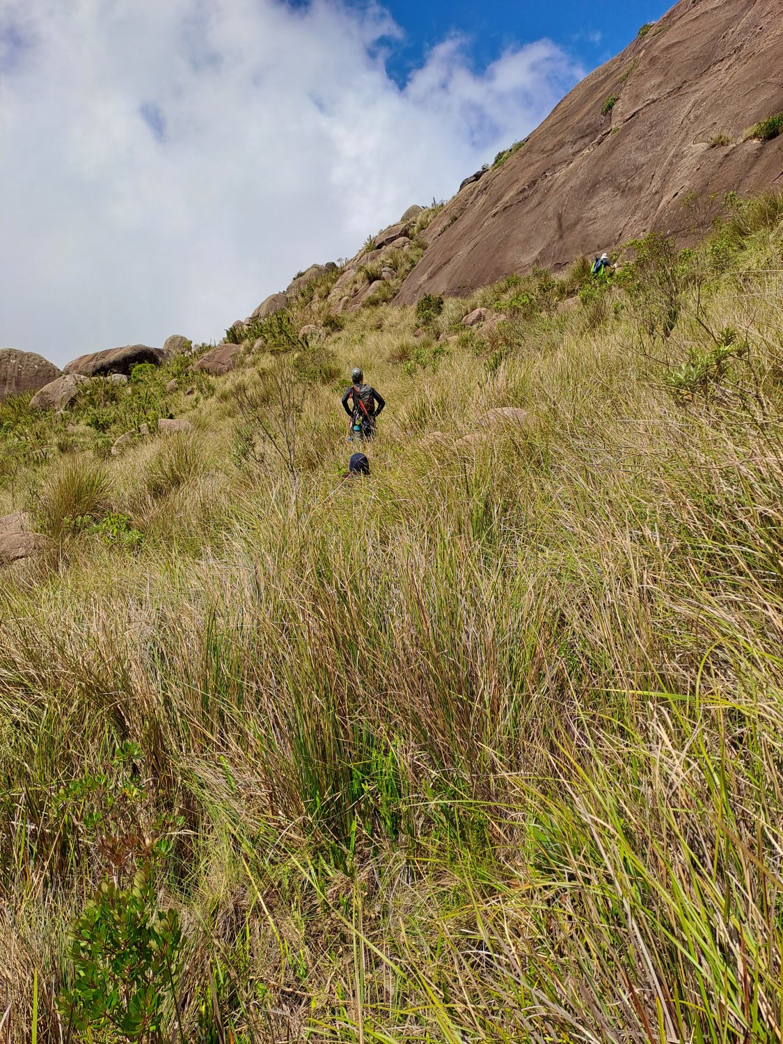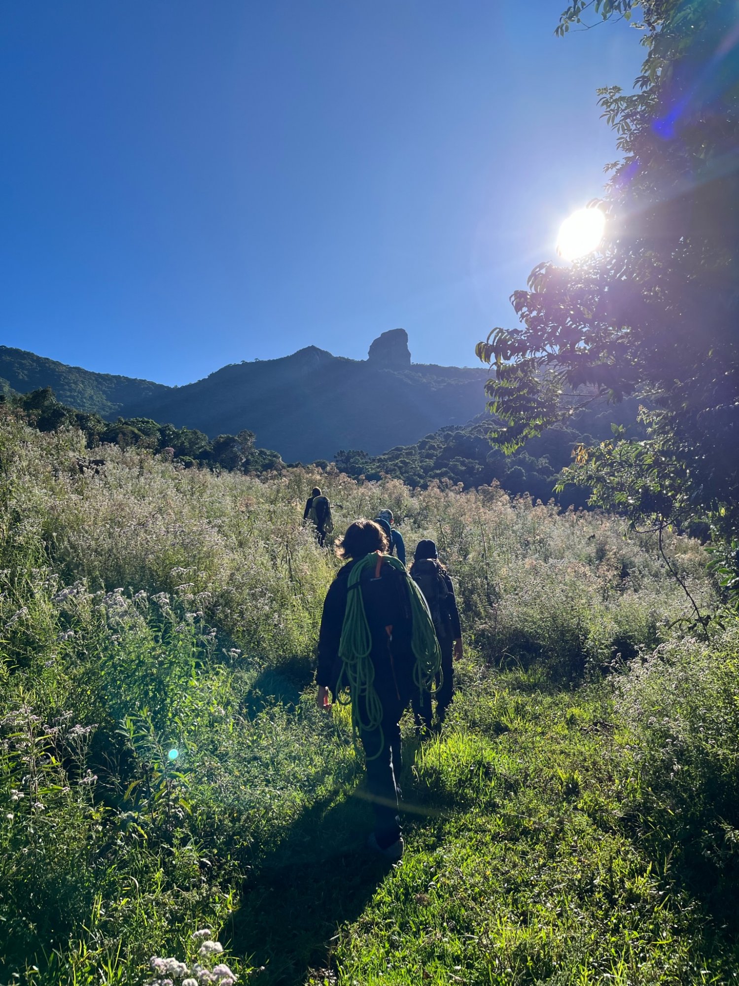 A circulação de vacas pela floresta cria caminhos alternativos no mato, que nos enganavam a todo momento, sendo difícil saber se estávamos no caminho certo. Eventualmente a trilha foi se fechando, passamos por diversas vegetações com muitos espinhos e carrapichos, o que nos levou a pensar que estávamos fora da trilha oficial. Apesar de não parecer a rota correta para a base da escalada, resolvemos insistir pois a direção fazia sentido e não queríamos desperdiçar o esforço de ter andado até ali, até que a trilha desapareceu completamente, e decidimos dar o braço a torcer e voltar até o ponto onde acreditávamos ter cometido o erro. Nota mental: Sempre estudar a trilha apesar de ter alguém experiente no grupo. Voltar logo que desconfiar do erro pode poupar muito mais esforço do que imaginamos.