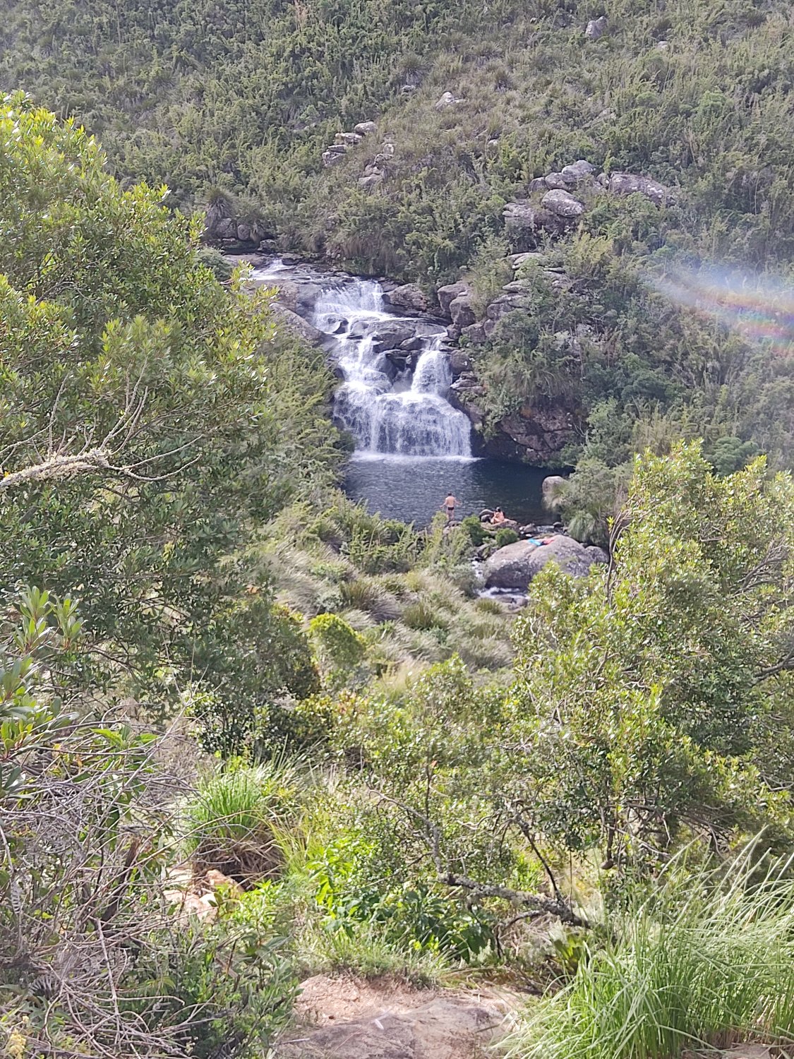 Apesar de lenta, a varação de mato para retornar à trilha principal foi menos traumática do que na vinda, já que ninguém estava afim de se arranhar nem se cansar além do necessário. Aline e Bernardo estavam resolvidos a dar um mergulho nas águas gélidas da Cachoeira das Flores, que fica próxima ao abrigo. Enquanto eles davam um tiro pra chegar lá mais rápido e com o corpo quente, eu, Luíza e Érica seguimos o caminho de volta na maciota, até porque subir os eventuais degraus de pedra da trilha já se provava dificultoso a essa altura.