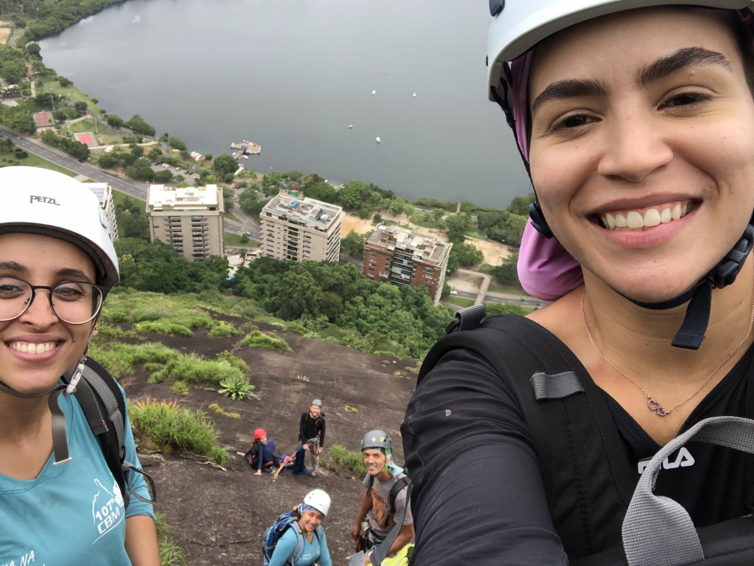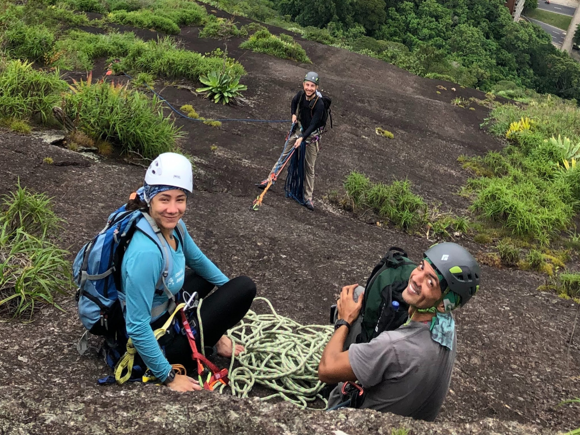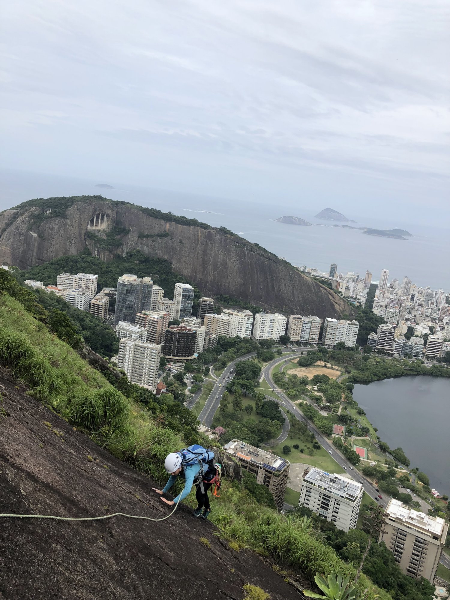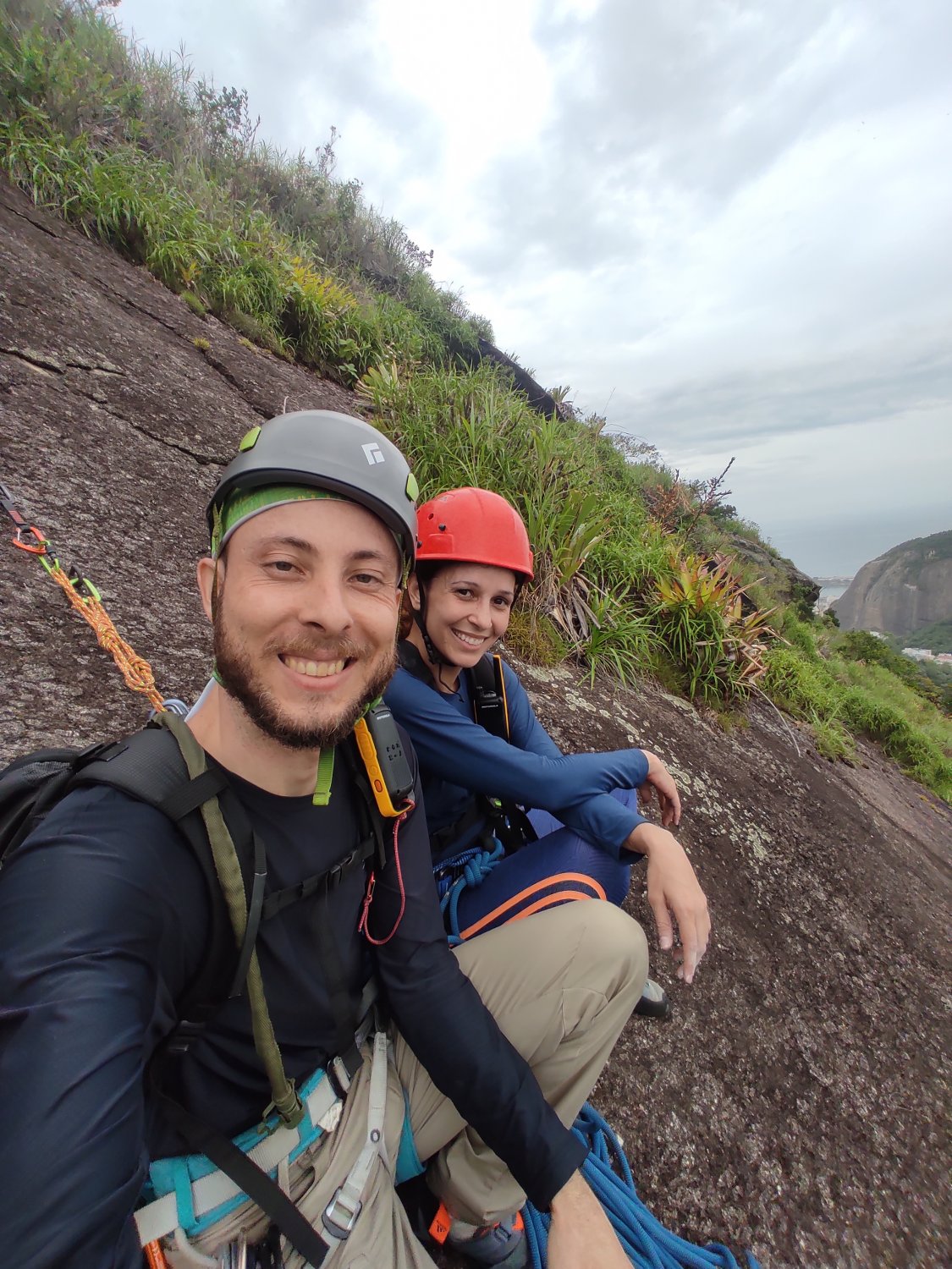 Apesar de ser uma via simples, foi dia de algumas primeiras experiências. Para mim e mais alguns foi a via mais longa que já havíamos feito. Também foi a primeira via que a Luíza guiou inteiramente sozinha, ainda por cima um E3, que também foi novidade pra mim. Além disso, consegui finalmente escalar no Morro dos Cabritos, algo que já queria fazer há muito tempo, por ser uma parede que fica bem perto da rua e sempre ter me despertado curiosidade.