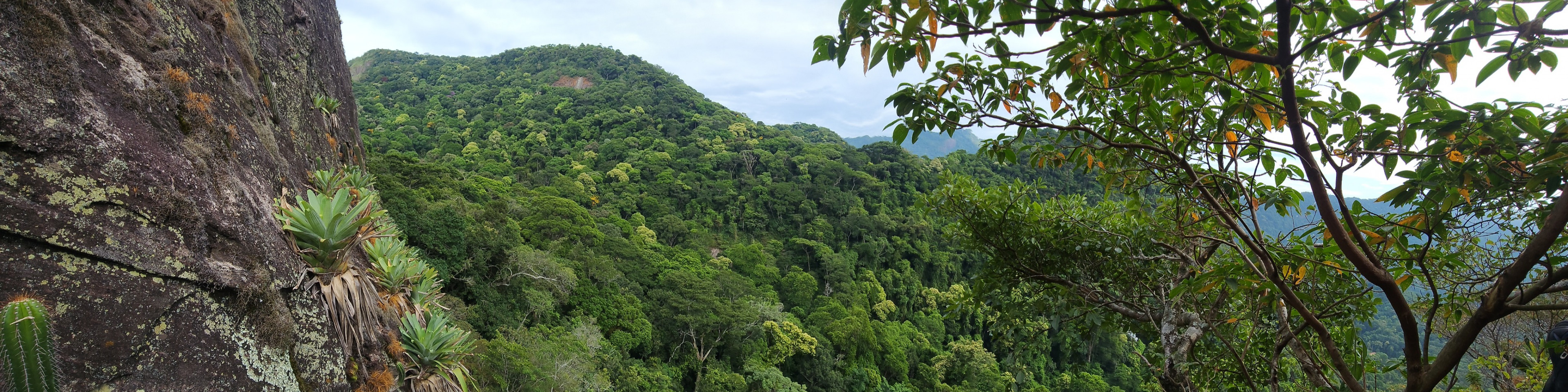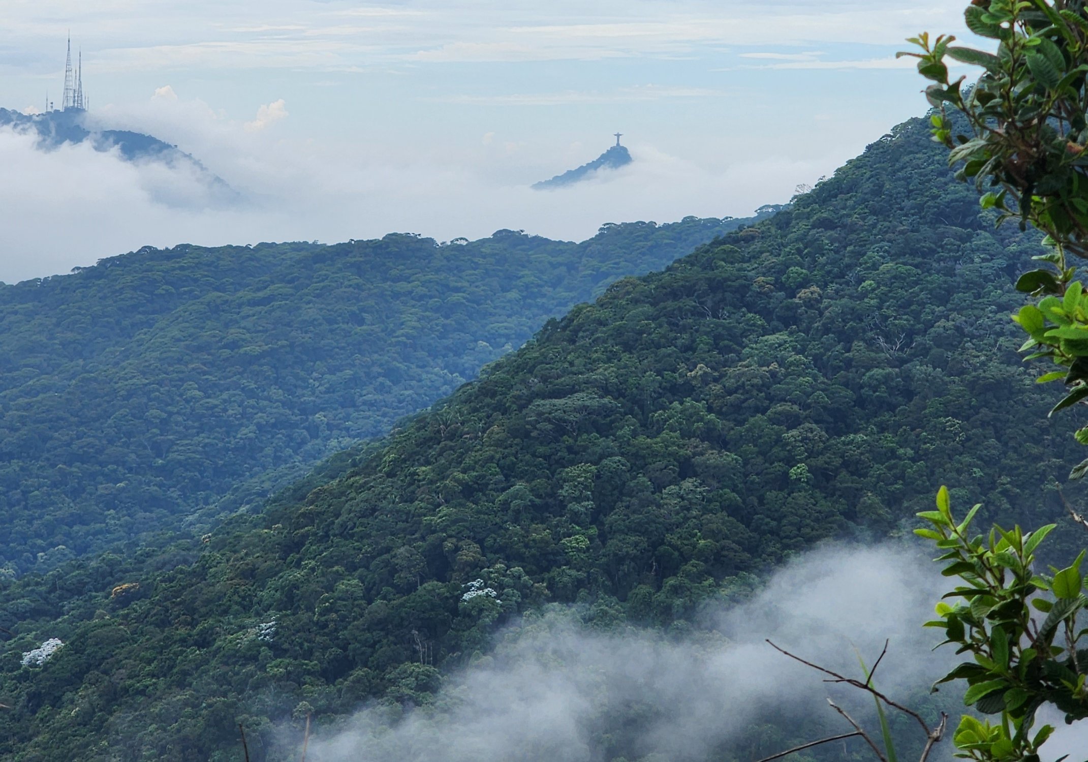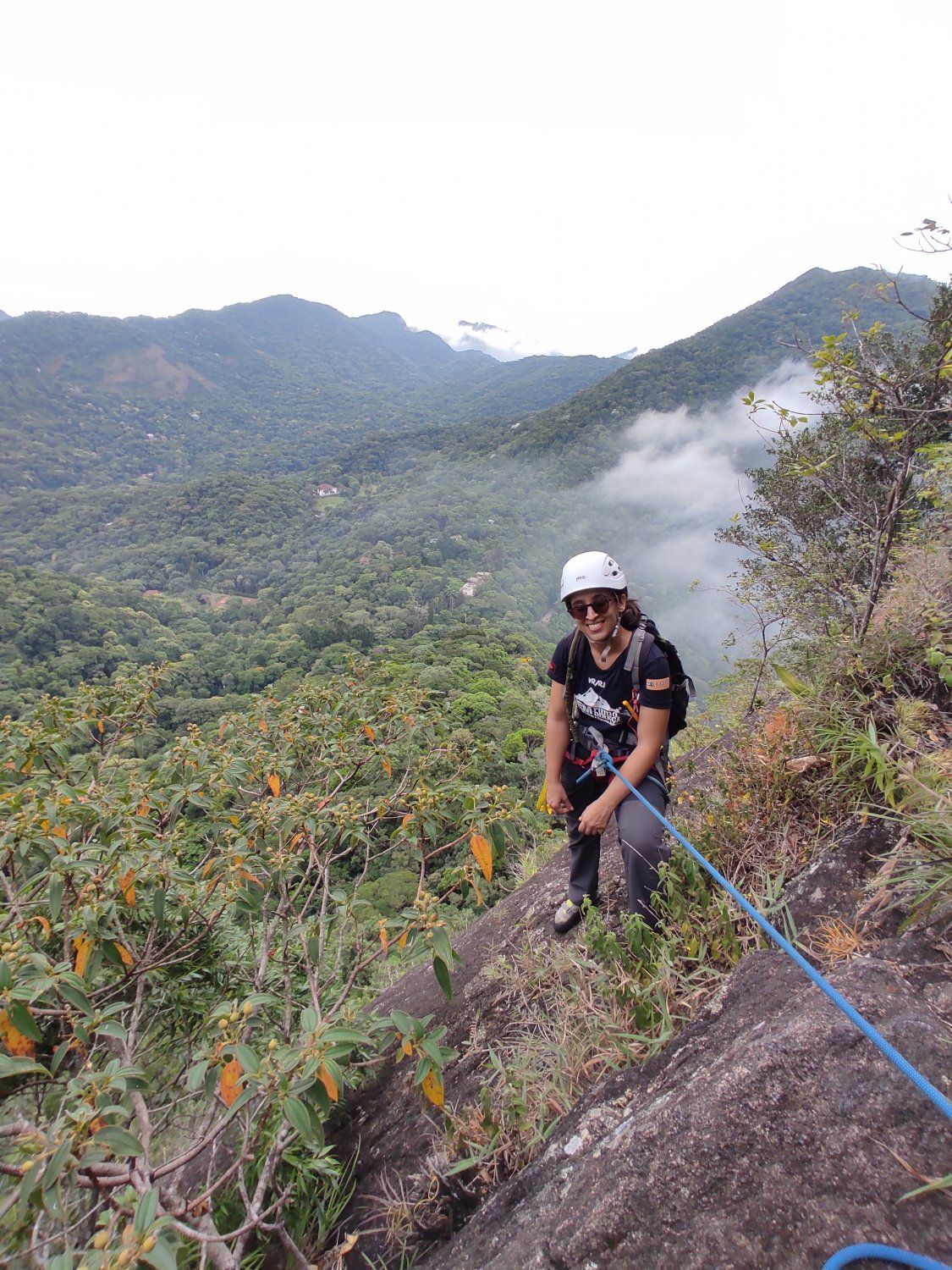 Essa quarta enfiada é uma diagonal de 2° grau de 45 metros, que apesar de fácil dá um barato por conta da exposição e da verticalidade, tanto para quem guia quanto pra quem vem depois. No trecho inicial é preciso colar o corpo na pedra para não ser jogado pra fora. Logo me juntei à Luíza na confortável parada em árvore da P4 e dali segui para passar pela Chaminé da Unha. Antes de chegar nela, ainda há uma passada de 3° grau para ganhar altura e subir em alguns blocos, que resolvi proteger com uma fita entre as pedras e costurar para evitar qualquer infortúnio. Não sabia o que esperar dessa chaminé, mas pelo tamanho do bloco imaginava ser um trecho de pelo menos uns 6 metros escalando nesse estilo. Acabou que, apesar de precisar jogar a mochila entre as pernas por conta da largura estreita, é mais uma escalada normal do que uma chaminé de fato, começando com alguns blocos de pedra que já te dão um certo ganho de altura e terminando num trecho de 2 ou 3 metros onde é possível usar as agarras da face da unha para vencer o lance. É um pouco sofrido, não há como negar, mas foi bem mais simples do que eu havia antecipado. Ainda tive que pensar um pouco e patinei em alguns momentos, já a Luíza passou de maneira bem mais limpa do que eu. Esse ponto, no topo da unha, tem uma vista privilegiada da floresta e boa parte do maciço da Tijuca, do Cristo aos picos. Daria pra ver também a Pedra Bonita se não fossem as nuvens baixas, mas nada a reclamar, já que estavam adicionando um charme extra na paisagem, que apesar de cinza pelo dia estar nublado, trazia uma atmosfera de isolamento de montanha todo especial.