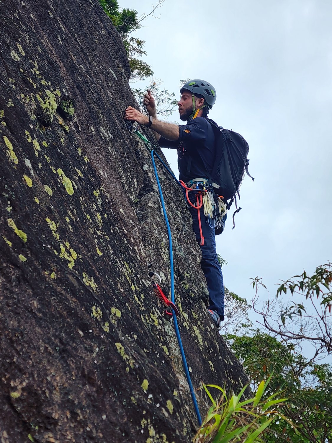 Escalada na via 15 de Novembro (2° IIIsup E2 D1), localizada na Agulhinha da Gávea