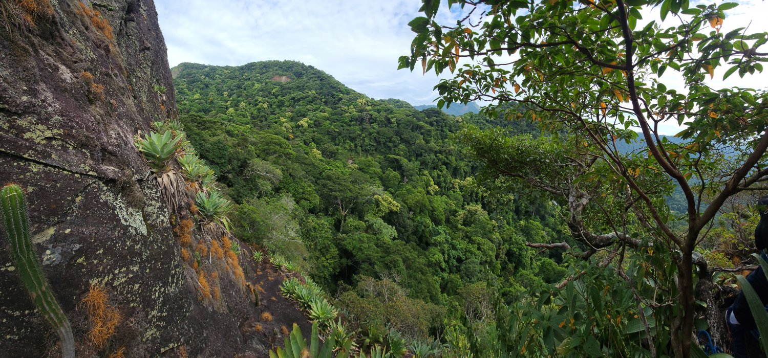 Nesse começo já deu pra sentir o estilo da escalada da Agulhinha, que envolve não só pedra como também uma mistura com a vegetação, algo bem natural e orgânico mesmo. E cactos, muitos cactos, além de outras plantas espinhentas que a todo momento te lembram de ter cuidado com onde colocar as mãos. Juntamente com o outro guia cheguei na P1, que como todas as paradas da via possuía um bom e confortável platô capaz de acomodar várias pessoas ao mesmo tempo. Como eu subi primeiro, a responsabilidade de zelar pelo bom manejo das cordas e evitar que elas se embolassem era do segundo guia, que além de tudo estava subindo com duas cordas por se tratar de uma cordada de 3. Mas segundo a Luíza, as cordas estavam uma bagunça e ela precisou se desembaraçar algumas vezes até chegar na parada. Tentamos ser os mais ágeis possíveis para deixar a outra cordada pra trás, e tão logo ela se ancorou montei a seg e ela seguiu para guiar a trilha que é a segunda enfiada. Fomos rápidos o suficiente e consegui sair antes do outro guia, o que separaria de vez as nossas cordadas.