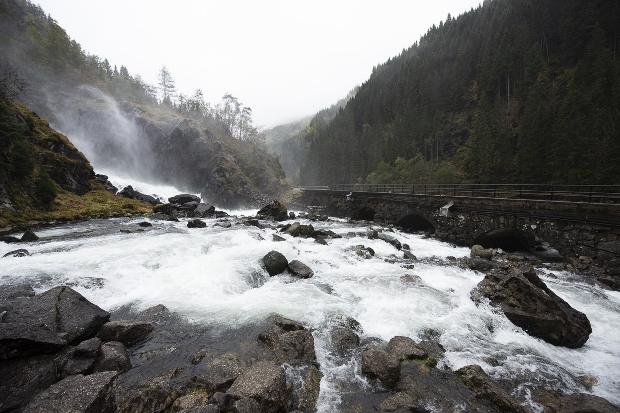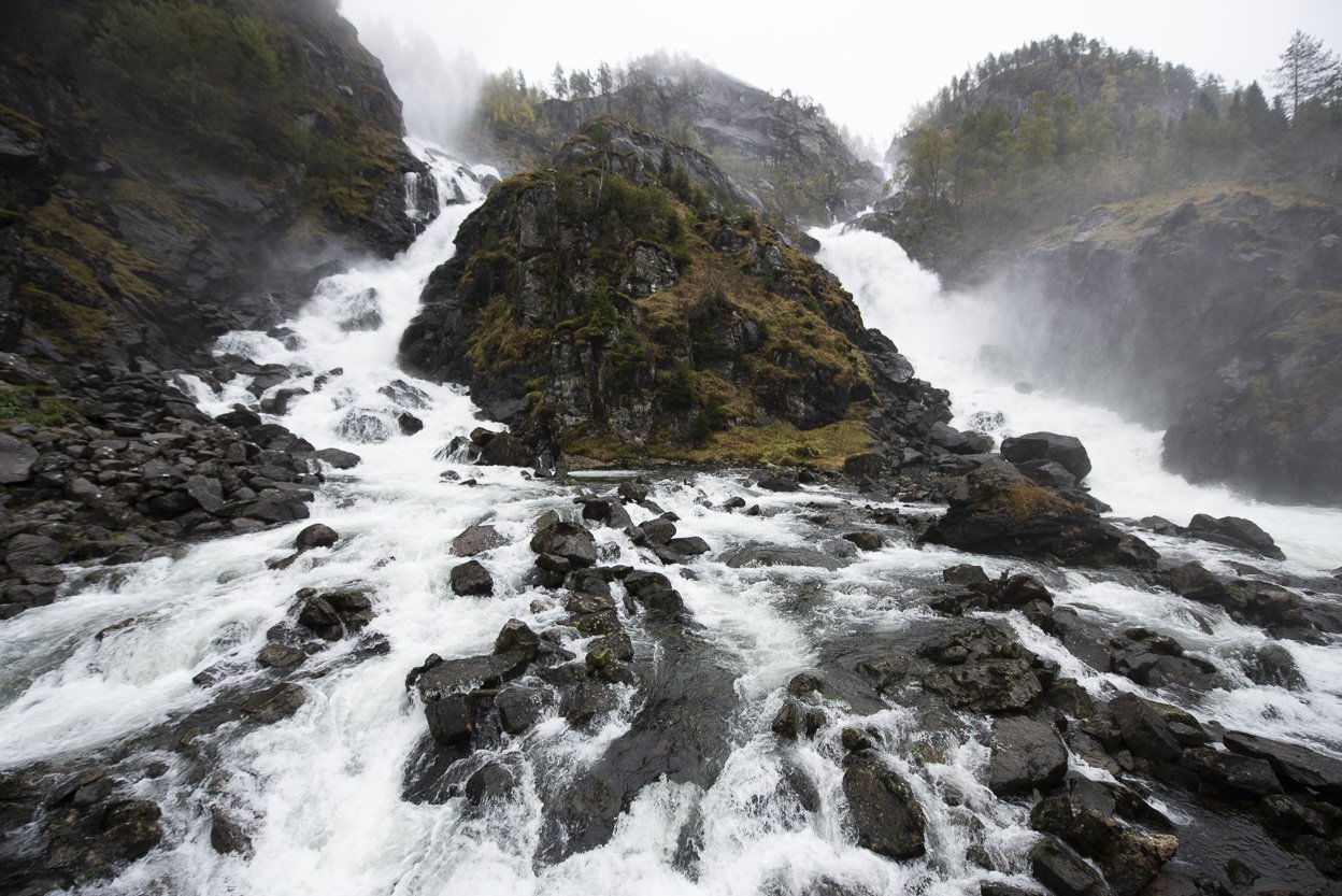 Angulo da Låtefossen mostrando ela cortando a estrada:
