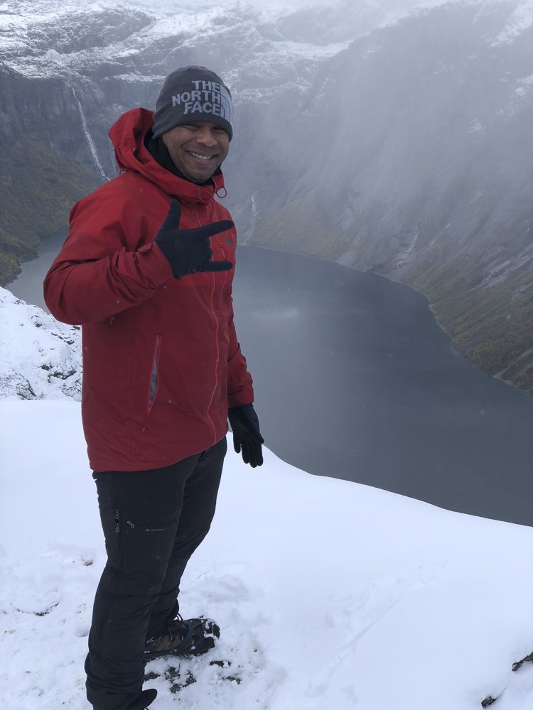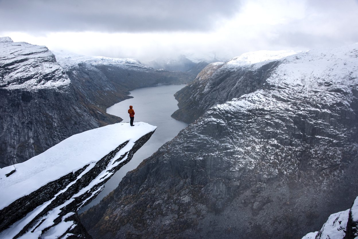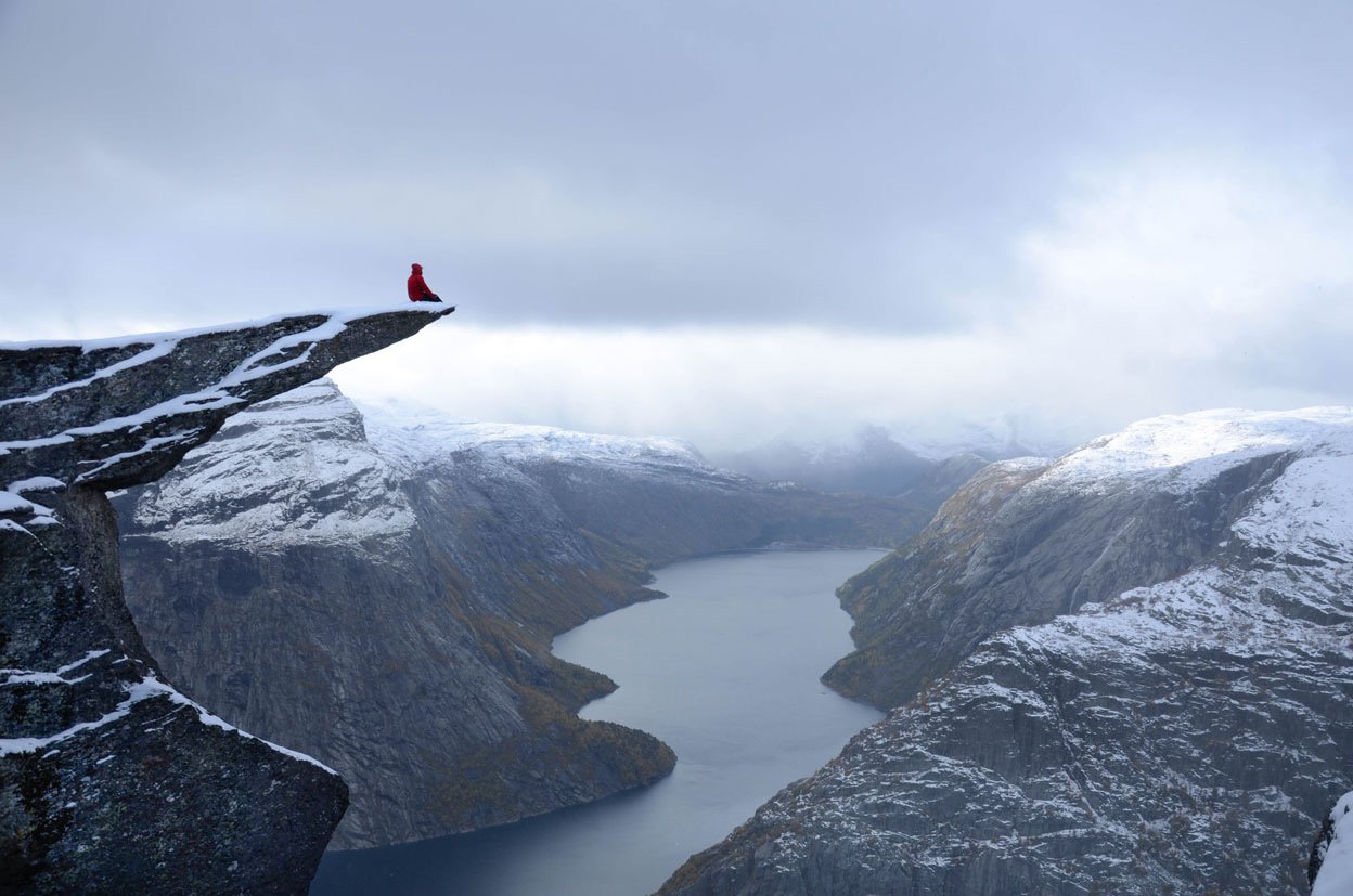Nesta foto, ainda estava na metade do caminho, mais as vistas do lago Ringedalsvatnet já compensava o esforço até aquele ponto. Trolltunga, foi algo que eu li uma vez num livro quando era bem pequeno, e falava dessa trilha que exigia muito esforços para chegar na rocha. E eu estava a poucas horas de conseguir isso. Continuamos andando e depois de duas horas. Chegamos nela, a lingua de Troll, debaixo de neve e tudo, e por sorte, diferente do verao nao tinha fila para chegar a ponta da pedra.
