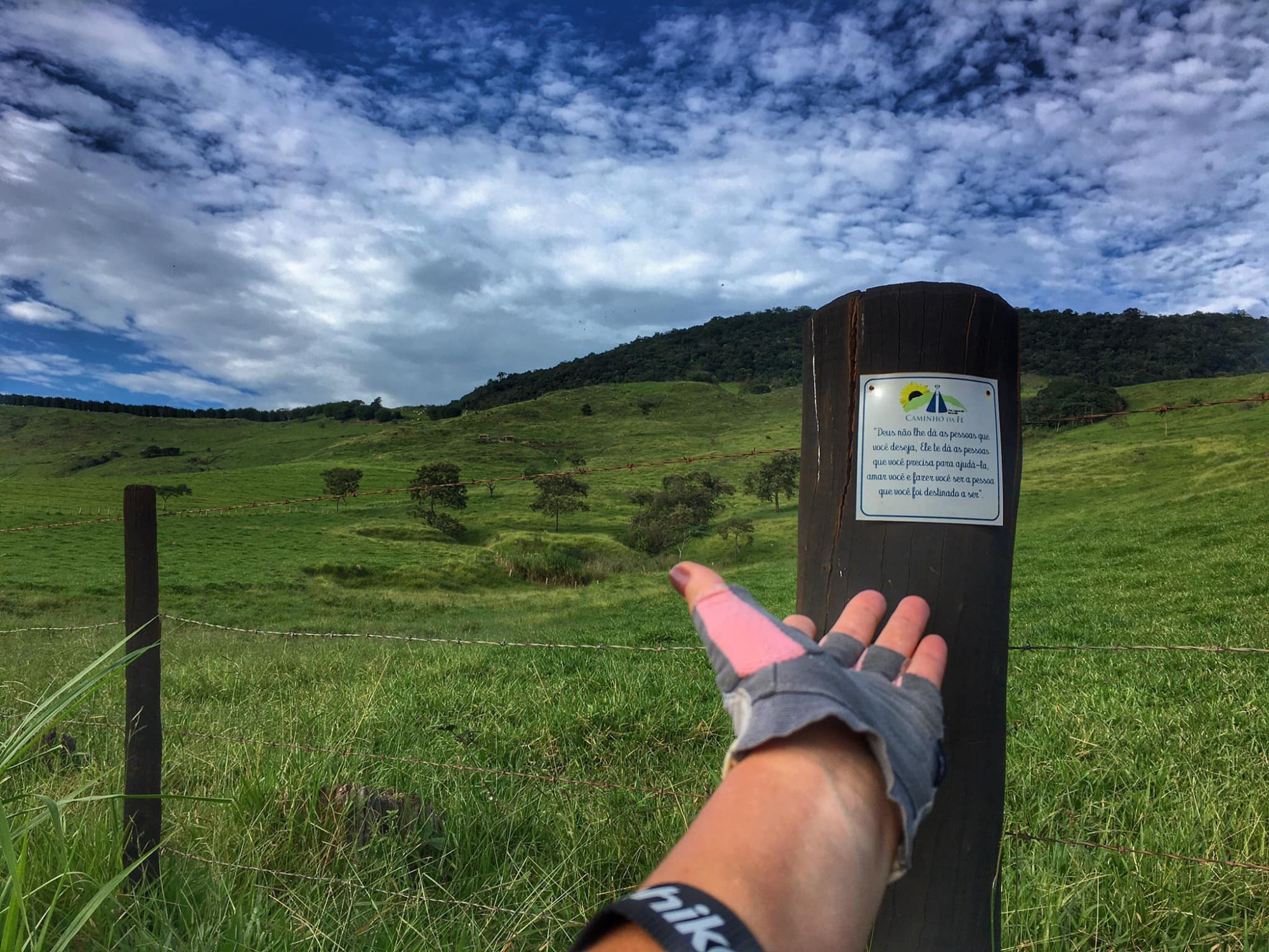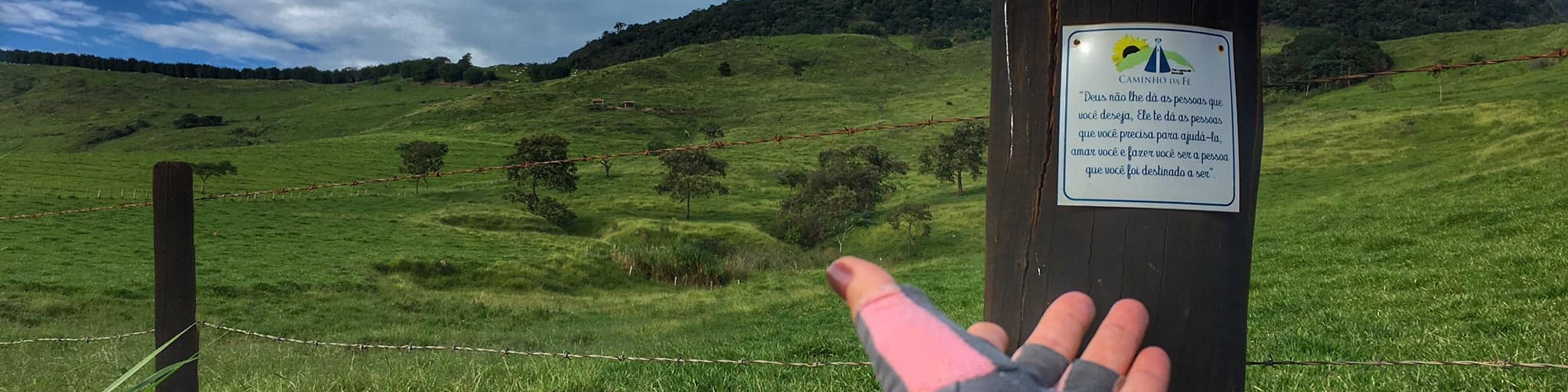 Além do presente que a natureza te proporciona as setas que surgem a cada km concluído vai te dando um rumo e as placas como frases vão te dando mais animo e folego .