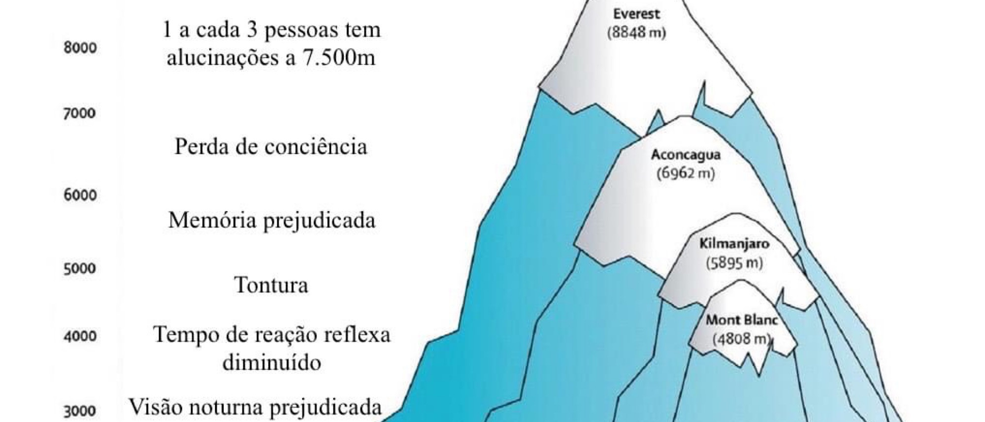 Quando no corpo de uma pessoa existe apenas 30 por cento do oxigênio que deveria, considera-se que ela está à beira da morte — ou seja, tanto pode estar na UTI de um hospital ou no topo do Monte Everest, a 8 848 metros de altitude. Se alguém saísse diretamente do nível do mar para lá, desmaiaria em alguns segundos e morreria em poucos minutos. Se demorar algumas semanas para fazer o mesmo percurso, no entanto, o corpo passa por um processo de aclimatação, uma série de mudanças que lhe permitem se adaptar e sobreviver. Mas não por muito tempo.