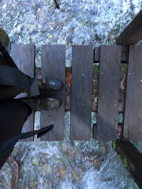 Às 11h chegamos no local de início da trilha ao Vale Cochamó. Estacionamos a mini van na casa do Sr. Cláudio, com quem trocamos uns 10 min de conversa. Antes de iniciarmos a caminhada, o Marcelo sugeriu a troca dos tênis impermeáveis por galochas de borrachas, decisão acertadíssima para o cenário que encontraríamos mais a frente.