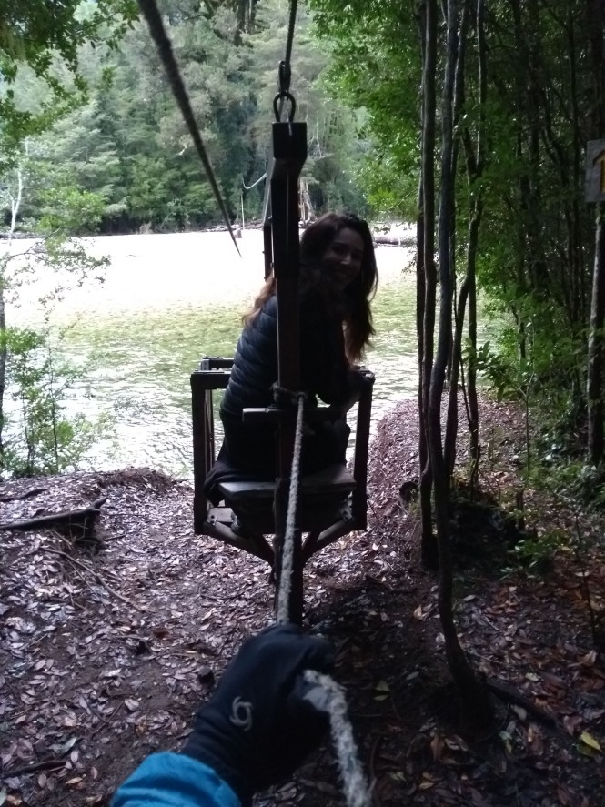 Fim de tarde, fomos visitar o Mono (Cristián Gallardo), Jupiter e Liwen. Por sinal, no vimeo tem um documentário sobre ele, chamado “El Mono de Cochamó”, película esta ganhadora no Festival de Cine de Montaña de Santiago em 2016. Cruzamos o rio em uma espécie de carrinho em tirolesa e andamos um pouco até o Refugio Cochamo, onde o Mono vive. Chegando lá, tive uma das experiências mais incríveis da minha vida. O amor por viajar esconde a curiosidade e gosto por histórias, ouvir, sentir, conhecer, conversar com as pessoas locais. Fomos convidados pelo Mono e Jupi a tomar café, e logo passei a conhecer mais da rotina de uma vida tão alheia a minha, mas que eu tanto admiro, respeito e até anseio. Enquanto deliciava a conversa e o café quente, ele nos convidou a pernoitar dentro do refugio, ao invés de passar frio no camping (pode acreditar que estava imensamente frio), e eu estava praticamente entrando no fogão a lenha do Mono. Aceitamos de imediato, e logo eu e Marcelo cruzamos novamente o rio para recolher nossas coisas no camping. Já estava escuro, e pela primeira vez usei a headlamp para andar no escuro à noite. O coração acelerado, quase saindo pela boca. Nem consigo descrever direito a sensação de cruzar o rio a noite, em uma tirolesa, sem enxergar nada além do que a pouca luz da headlamp apontava. Foi incrível, e eu só pensava que se minha irmã tivesse ali, teria um ataque de nervos. Rezei para que nenhum bicho, que até então eu não havia avistado, resolvesse dar as caras. Pegamos nossas mochilas, e voltamos para cruzar o rio novamente, prendendo a mochila no carrinho, para não cair na água.