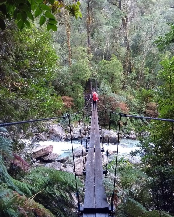 As flora da selva valdiviana é rica, densa, deslumbrante, e a trilha em sua maior parte margeia o rio, sendo possível observá-lo bem de perto em alguns trechos ou ouvi-lo quando oculto atrás das árvores. Não sei se em razão da época que fui, início do inverno e por fazer muito frio, quase não se ouvia pássaros ou qualquer outro ruído além das águas. Um silêncio divino. Não identifiquei muitos odores, somente às vezes quando passava por algumas árvores era possível sentir o cheiro do protetor solar ‘coppertone’. Passamos uma ponte suspensa que cruza um trecho do rio, e por outras pontes menores que facilitam cruzar alguns trechos onde riachos passam por pedras.