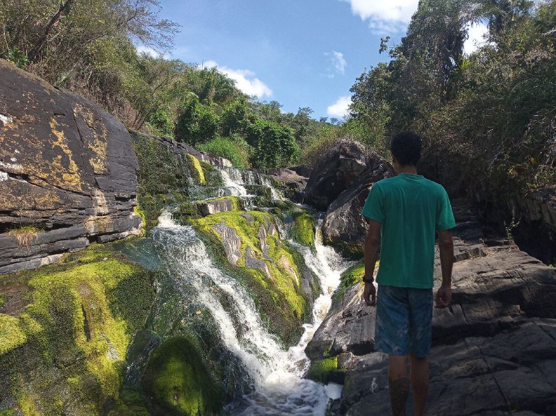 Me direcionei com Graziela e continuamos pelo leito do rio, num trecho de "pula pedras". Paramos e resolvemos merendar e da um tempo até mesmo para ver se o grupo saía da queda. Um rapaz, morador de Muritiba/BA, estava fazendo a trilha só e nos informou que a terceira e ultima queda está alguns metros leito do rio abaixo, que era para a gente ir até lá. Chamei Graziela e fomos.