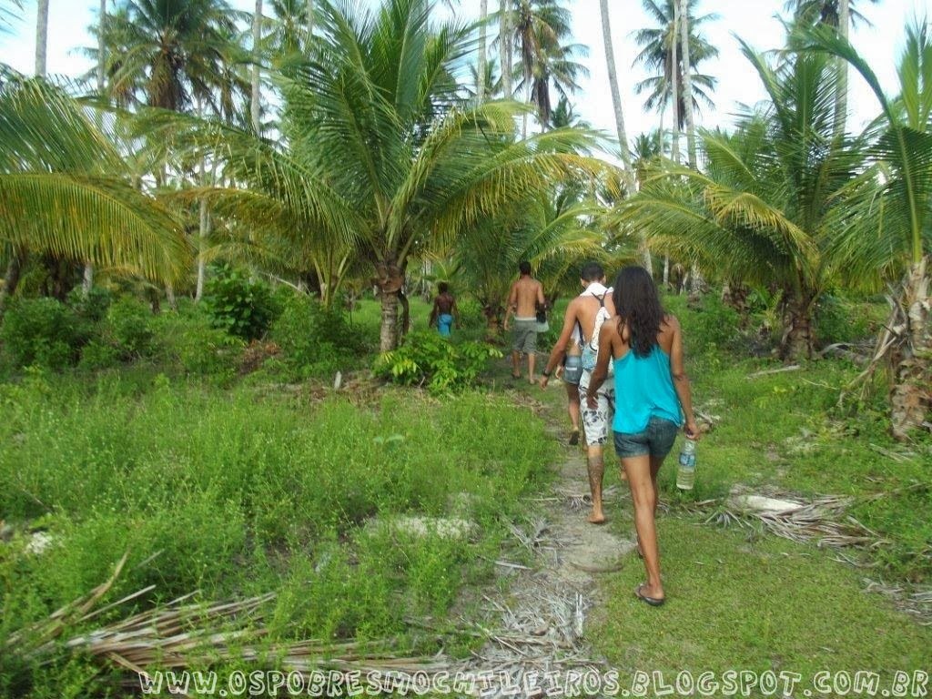 Saindo da Praia da Ponta dos Castelhanos caminhamos por uma grande trilha em uma imensa fazenda de plantação de coco. No meio do caminho encontramos um grupo de nativos que estavam colhendo capim para os cavalos e eles estavam cheio de mangas. Paramos e degustamos umas mangas, era fruta demais.
