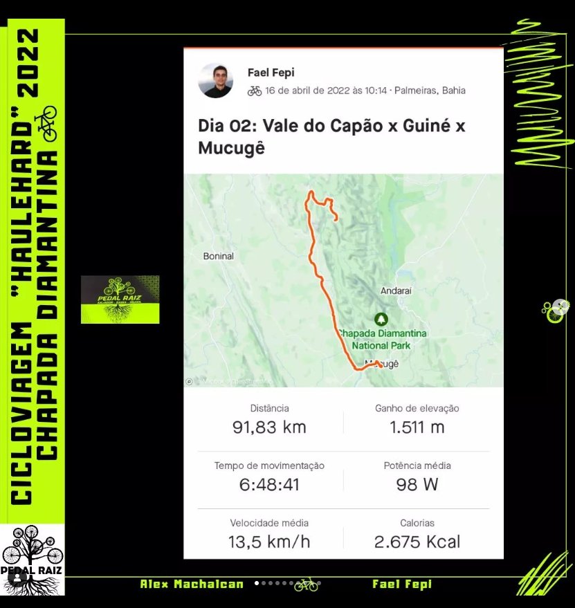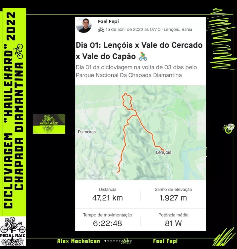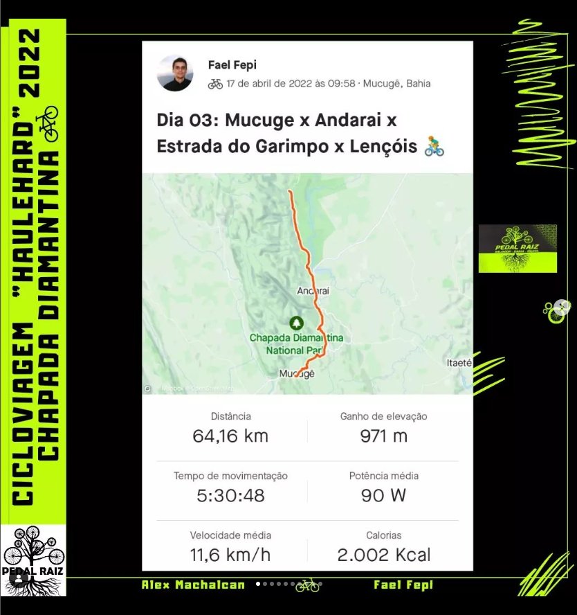 Durante três dias e duas noites, entre os dias 15/04/2022 à 17/04/2022, fiz o percurso com meu amigo @alex.machalcan , de bicicleta, estilo “bikepacking”, representando o grupo de ciclismo do Pedal Raiz Salvador @pedalraizsalvador , aos arredores do Parque Nacional da Chapada Diamantina, Bahia, percorrendo entre os municípios de Lençóis/BA, Palmeiras/BA, Mucugê/BA e Andaraí/BA.