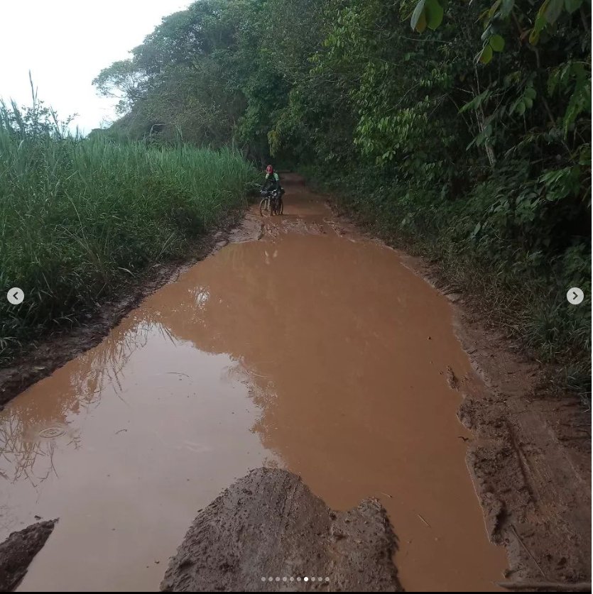 Um pouco antes do povoado de Tejuco, que pertence ao município de Palmeiras/BA, pedalamos em fortes declives, chegando a quase 50 km. Alex Machalcan deve ter passados dos 50 km, nas ladeiras de terra acidentada. Pegamos uma forte chuva, com raios e trovões, que chegava ao ponto de assustar, além de passar por trechos alagados e de lama. Fiz vários “drifts” e quedas discretas.