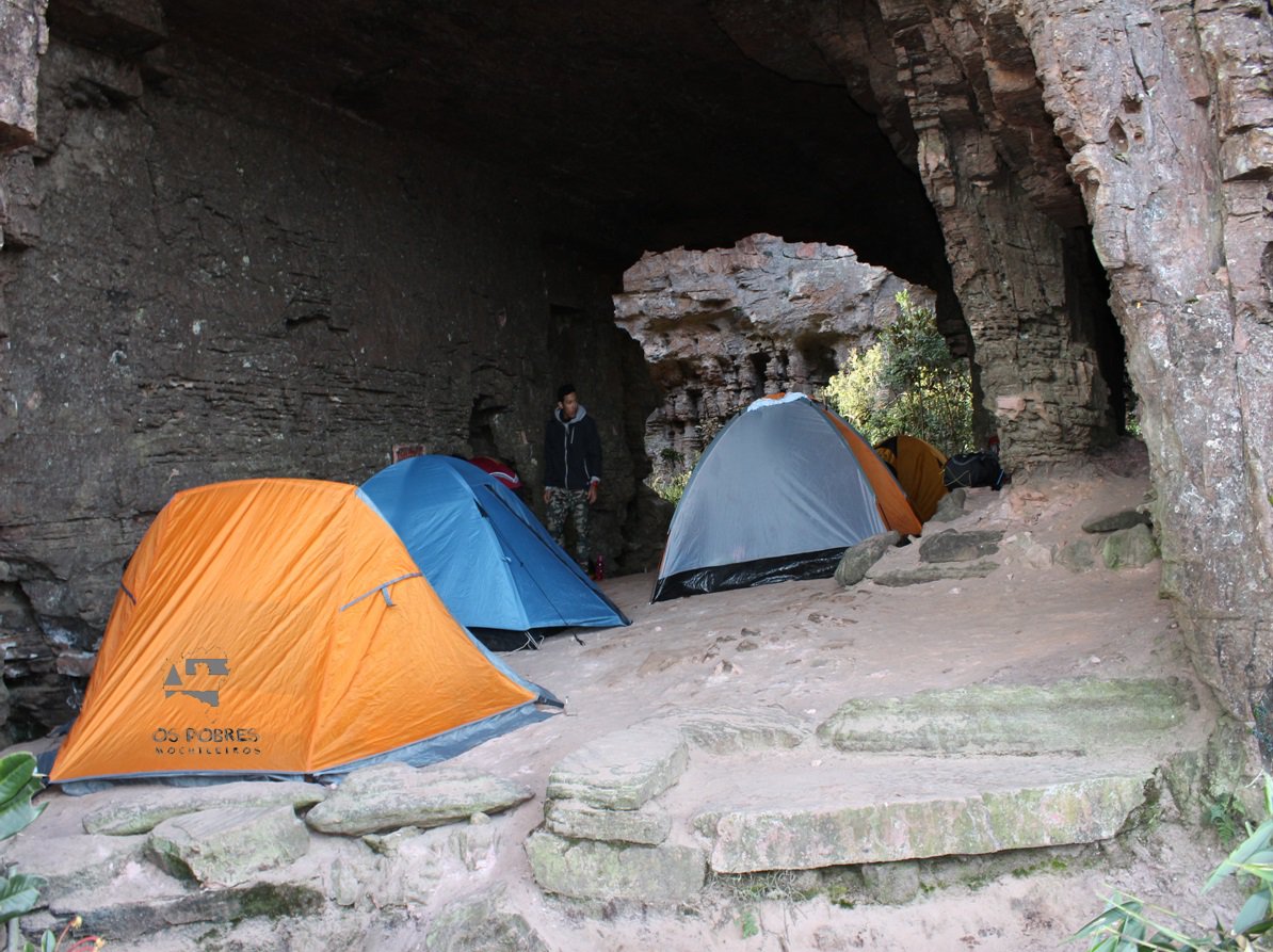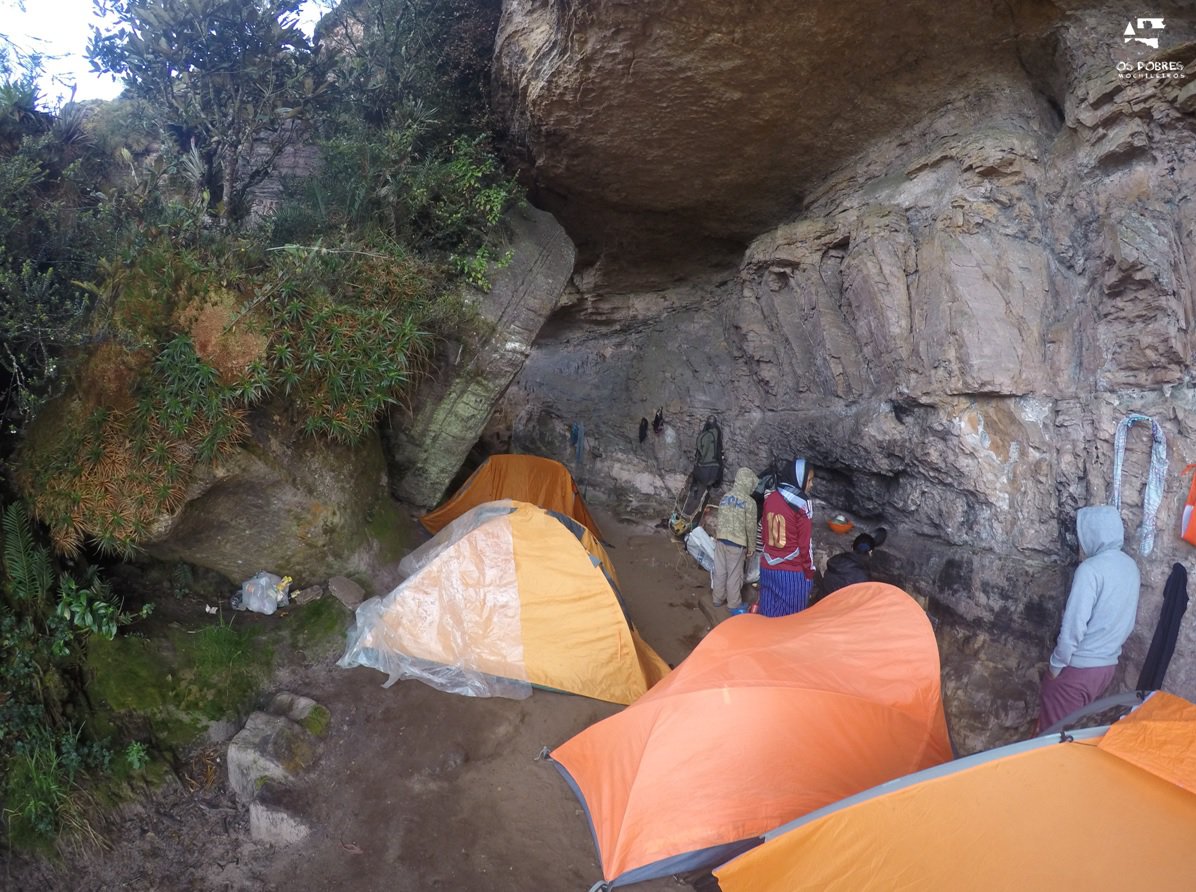 Os guias Kliber, Oxcel, Mellani, além do menino Santi, bivacaram em um dos corredores ao fundo da caverna, bem na margem esquerda do córrego que passa pela formação rochosa. Lugar bem interessante onde os guias se concentram e escolhem para descansar. Esse ponto é o melhor de todos da gruta do Quat Brasil, protegendo dos ventos fortes e das chuvas.