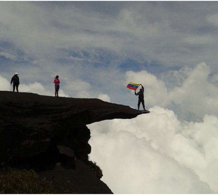 Uma rocha ponte aguda, se estendendo até o abismo. A La proa é o ultimo ponto do Monte Roraima a ser conhecido. No local Katherine estendeu a bandeira da Venezuela, bastante orgulhosa do feito. Oriana e Álvaro foram depois observar a paisagem e fazer registros fotográficos. Muitas nuvens cobriam a paisagem do Planalto das Guianas, impedindo em observar as áreas mais baixas do Parque Nacional Canaima.