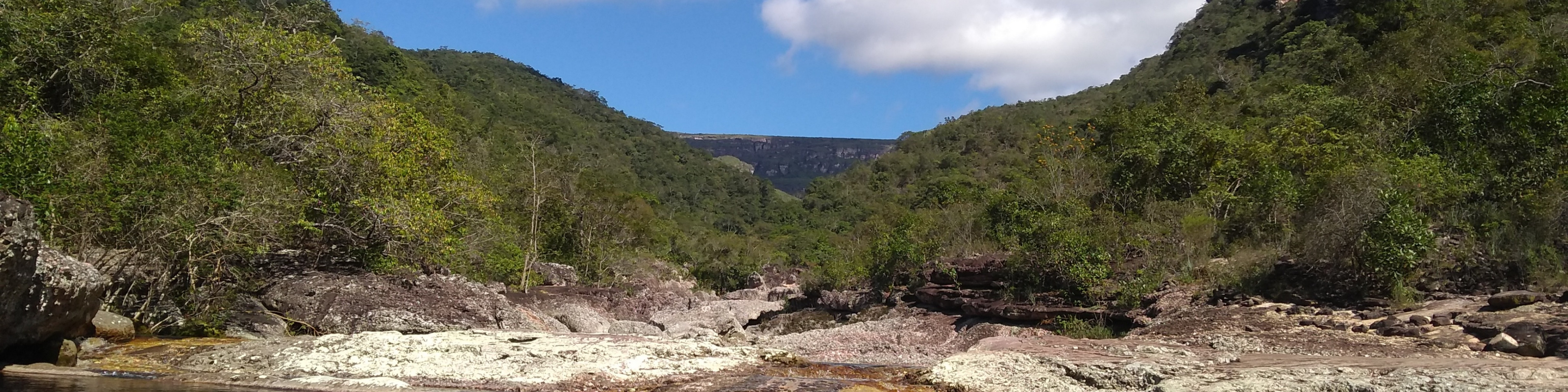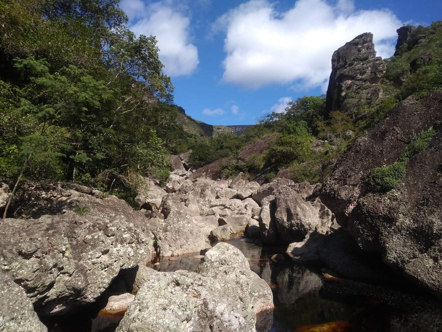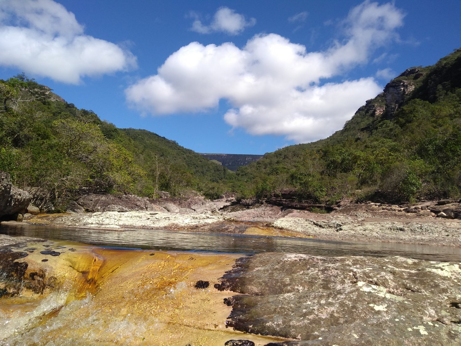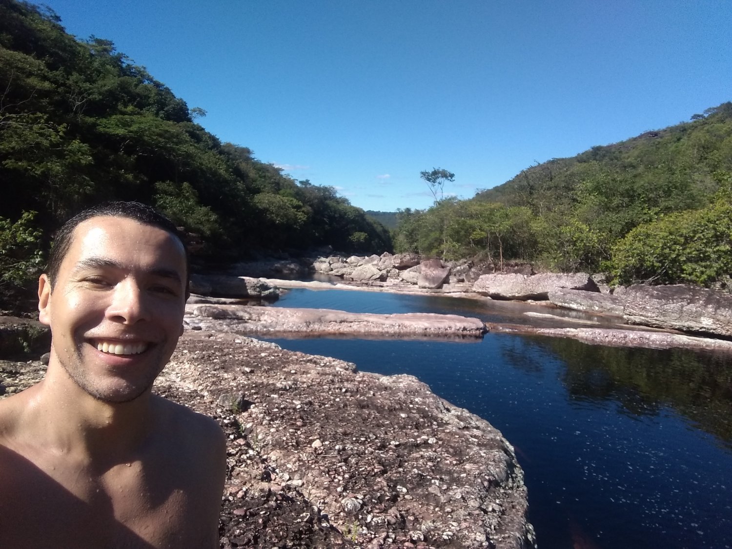 Depois de ficar ali por quase 1h começo a voltar a trilha, pensando em achar um local que me sentisse mais seguro para tomar um banho de rio. Paro justamente na pedra furada e fico lá por um tempo também, o sol está batendo, o clima está gostoso e a água ali naquele ponto já não é tão gelada. Continuo seguindo a trilha de volta, o caminho agora é bem mais fácil e intuitivo. Paro no ribeirão de cima para mais um banho de rio, novamente estou sozinho e posso aproveitar o local com toda tranquilidade do mundo, com uma vista muito bonita também. Pelas 15:00h começo a voltar em direção a cidade, no caminho encontro várias pessoas indo em direção ao ribeirão do meio e de baixo. Por volta das 16:00h chego de volta a cidade e vou procurar um lugar para hidratar, fazia muito calor.