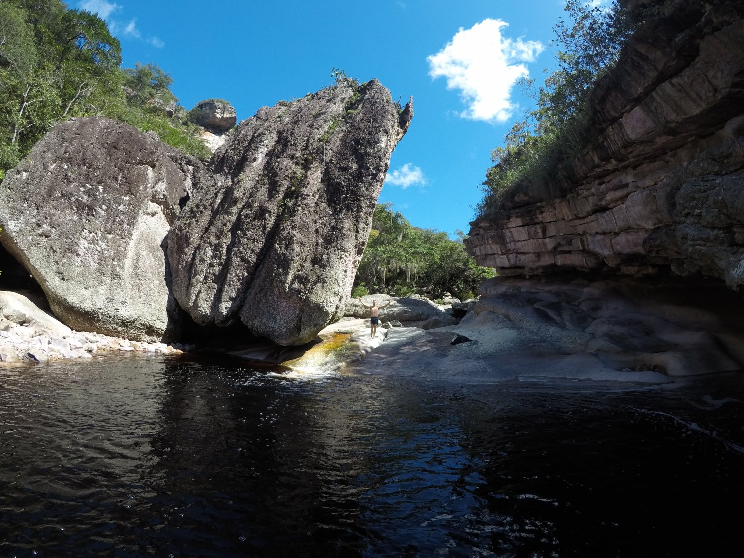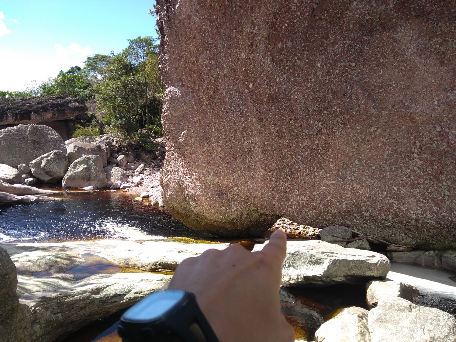 Quando chego no rio, imagino que o caminho é pelas pedras, sigo pulando de pedra em pedra, um baita exercício e bem divertido. Conforme vou subindo o rio as pedras vão aumentando de tamanho, começo a pensar que o caminho está um pouco mais difícil do que deveria. Olho para o mapa, deveria ter um caminho pela direita, saio para a "margem" e encontro as marcas no chão, bem mais fácil agora. Em um determinado ponto chego em uma pedra grandona, com um represado, local muito bonito, o caminho seguia passando por um buraco embaixo dessa pedra, muito legal . Desse ponto caminho por mais uns 30-40min pelas pedras até chegar em um mirante e dar de cara com a cachoeira, uma queda bastante grande, forte e com um poço bastante escuro. Estou sozinho ali, fico muito feliz, rindo sozinho, aproveito para tirar algumas fotos e fazer um lanche. Desço o mirante para ter acesso a parte de baixo da cachoeira. Fico sentado lá sozinho por mais um tempo. A água está muito gelada. Penso um pouco e decido não entrar na água, por algum motivo achei perigoso. Depois de uns 30 minutos chega o guia com o casal, eles logo se jogam na água.