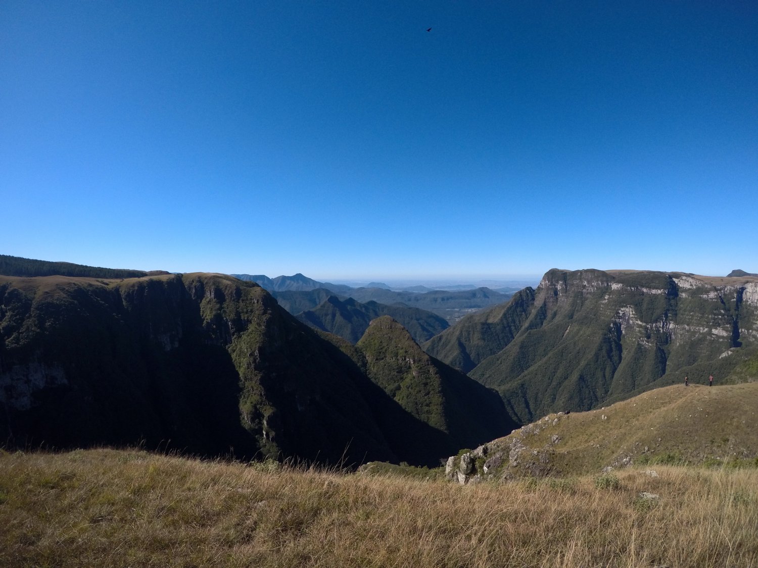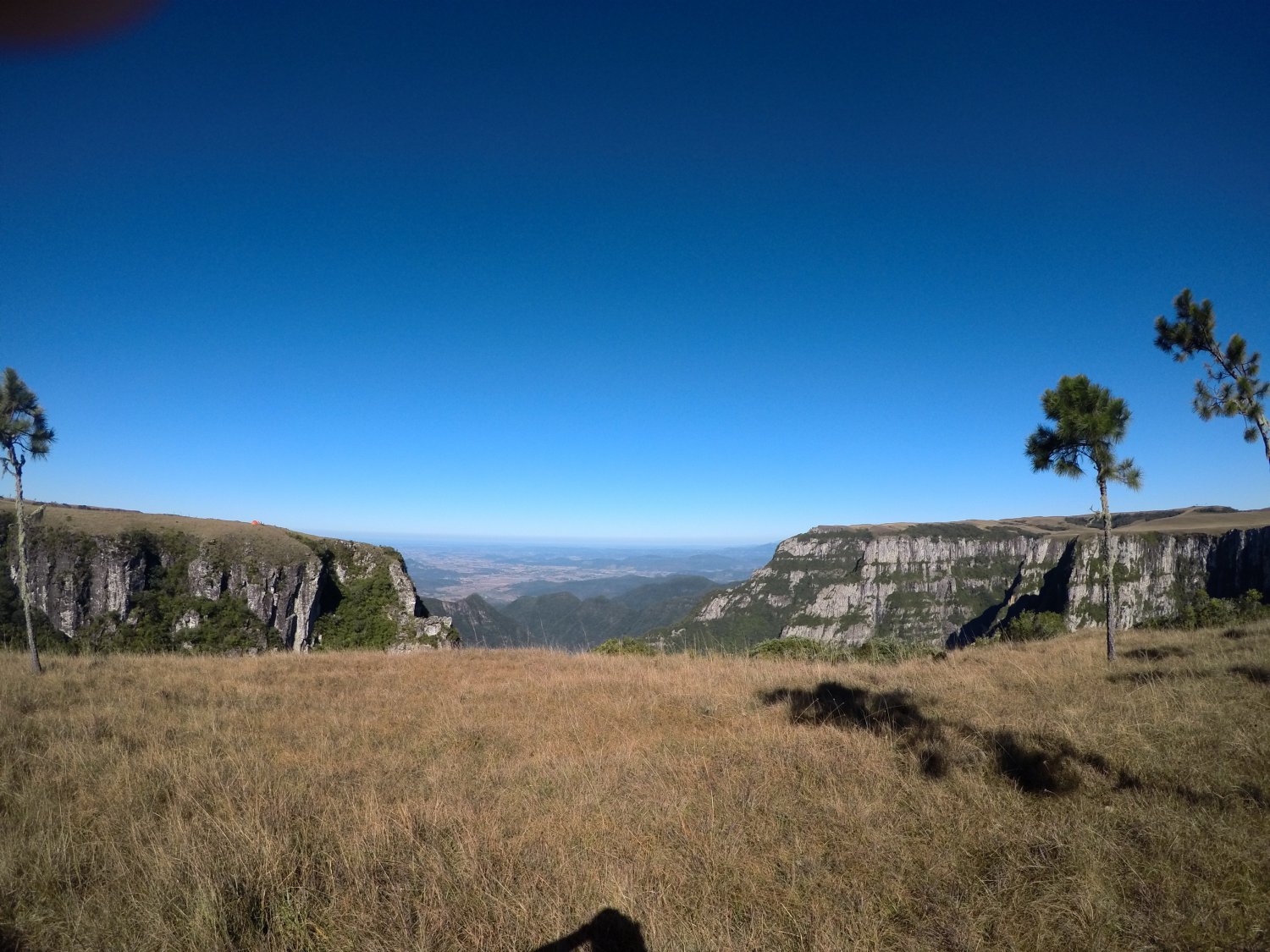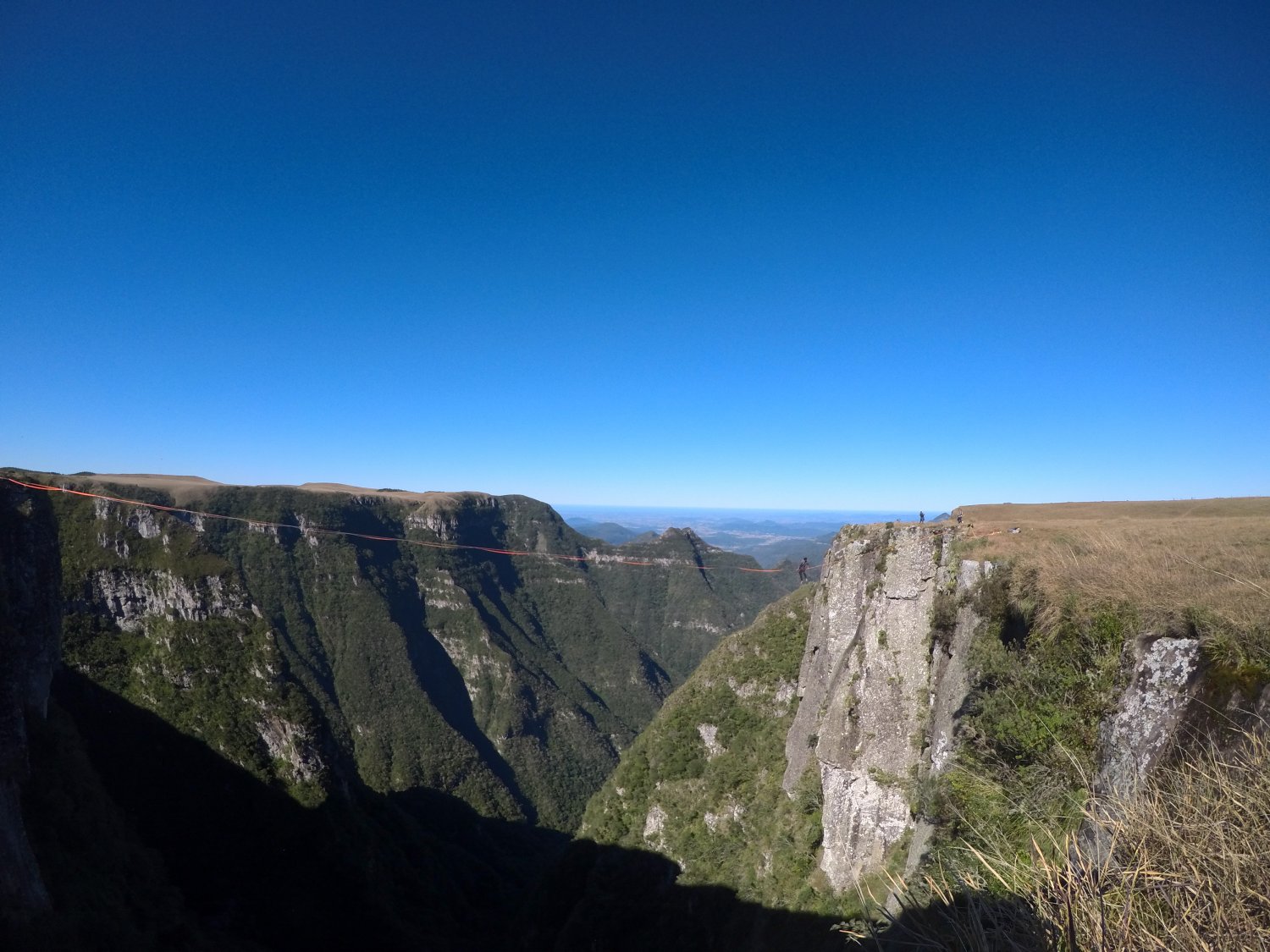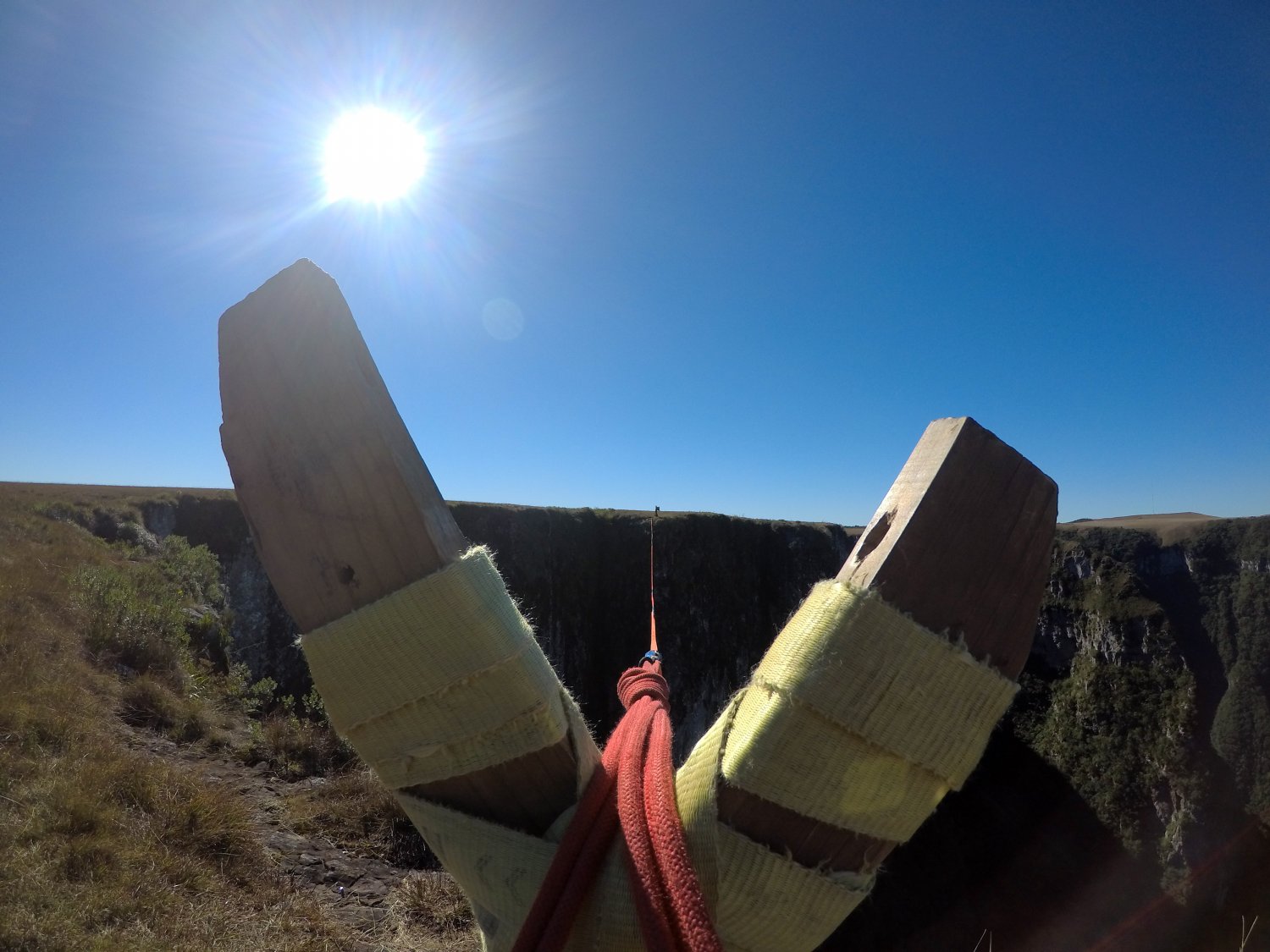 Quando finalmente finalizamos tudo e o Icaro está se preparando para subir na fita, aparece um casal de gauchos muito sem noção, era possivel escutá-los do outro lado do cânion tranquilamente. Quando viram ele se posicionar para entrar na fita começaram a falar coisas do tipo "nossa, nunca que faria isso", "e se arrebenta? " , "credo que louco" e várias outras coisas que acabaram tirando a concentração dele, pronto, o highline para ele acabou ali. Lá pelas 14:30h quando ele resolve parar as tentativas foi a minha vez de tentar entrar na fita, com muito medo e com a adrenalina nas alturas vou para a borda, fazemos a clipagem, escorrego um pouco pendurado, olho para o tamanho do vazio abaixo de mim, sinto o momento, vou mais um pouco, a adrenalina é muito grande, o medo também. Depois de alguns minutos volto para a borda com a sensação de que ganhei o dia. Arrumamos as coisas e vamos embora.