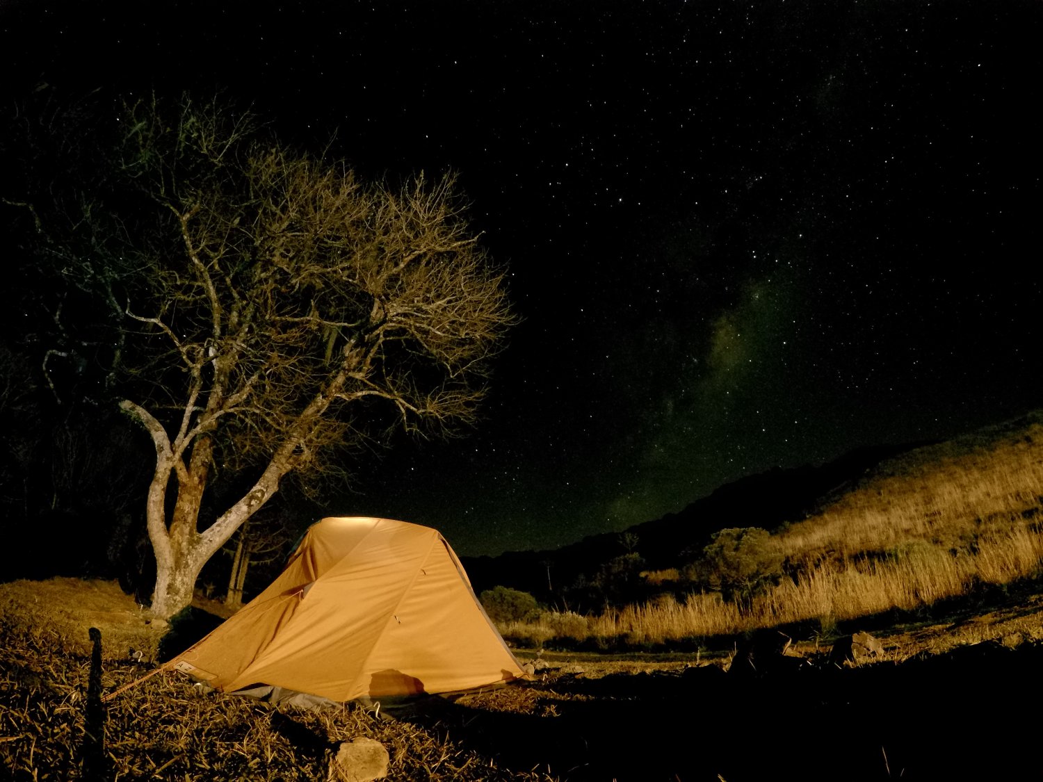 Após chegar do Pico do Rinocerote, almoçar e arrumar o acampamento, tiro um tempo com calma durante a noite para tomar uma cerveja, escrever o diário de viagem e conhecer algumas pessoas que trabalham no local. Contudo quando é por volta das 22:00h já vou para a barraca, faz MUITO frio, e como o local fica em uma baixada, o sol se esconde muito cedo e também toda a massa de ar fria fica acumulada por ali. Levanto por volta das 3:00h da madrugada para fazer xixi, o céu está completamente estrelado e todas as coisas ao redor estavam congelando, inclusive a barraca e a bicicleta.
