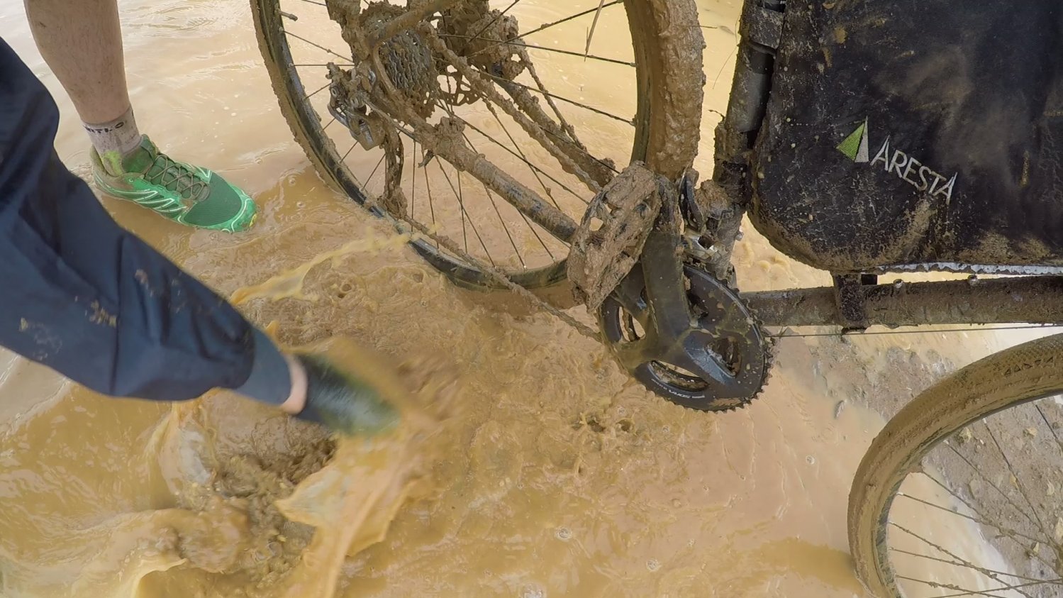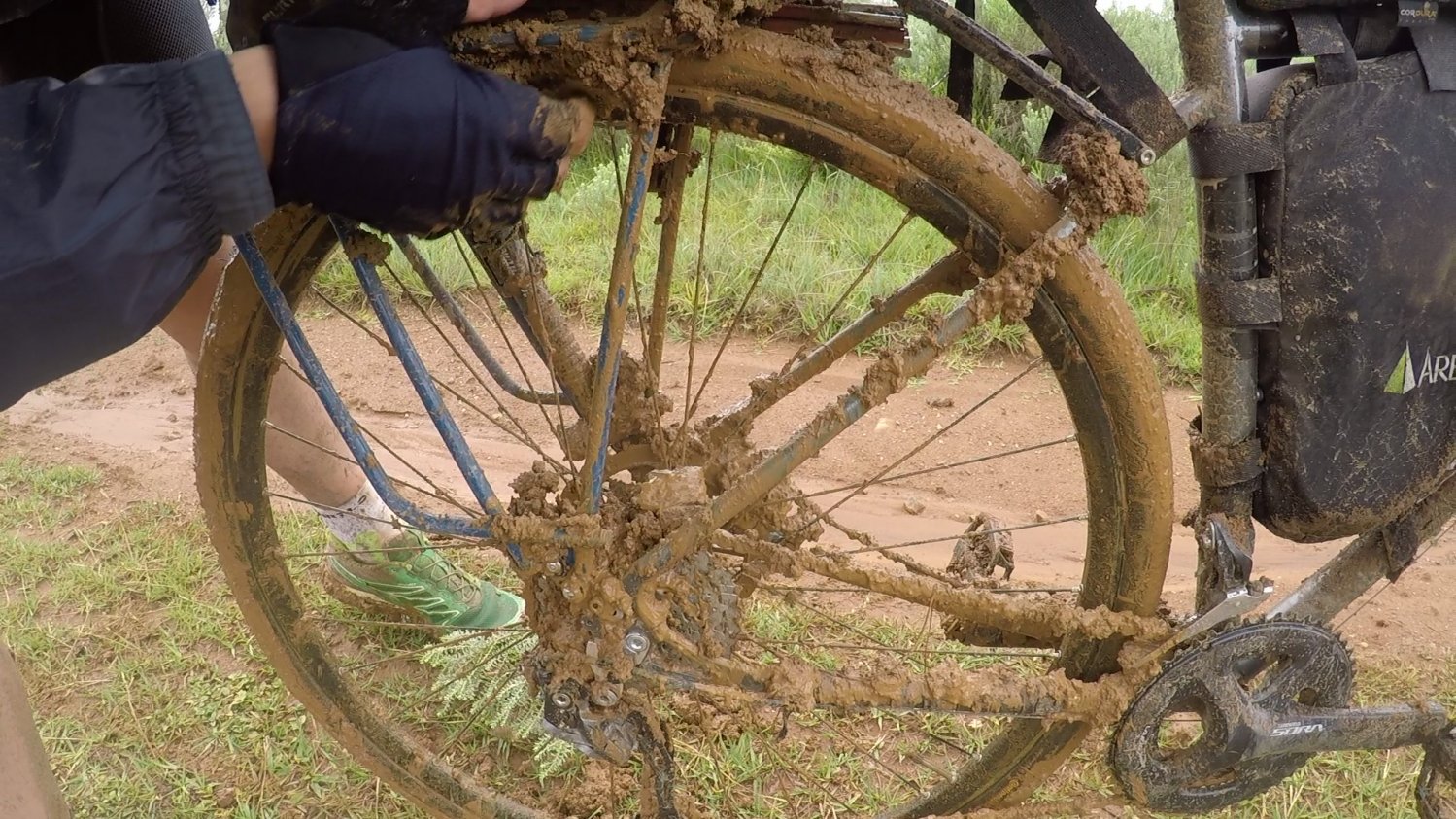 No alojamento arrumo todas as minhas coisas e a bicicleta, é hora de agradecer e dar tchau. Quando são quase 9 horas já estou pedalando. A estrada com barro deixa o deslocamento mais pesado, mas com uma sensação de conforto, visto que as pedras assentaram no barro. Em alguns pontos menos batidos o barro começa a acumular na bicicleta e o sobe e desce para liberar o pneu começa. Em uma dessas paradas para liberar espaço para o pneu girar, vejo no horizonte a chuva se aproximando e em poucos minutos ela me alcança.