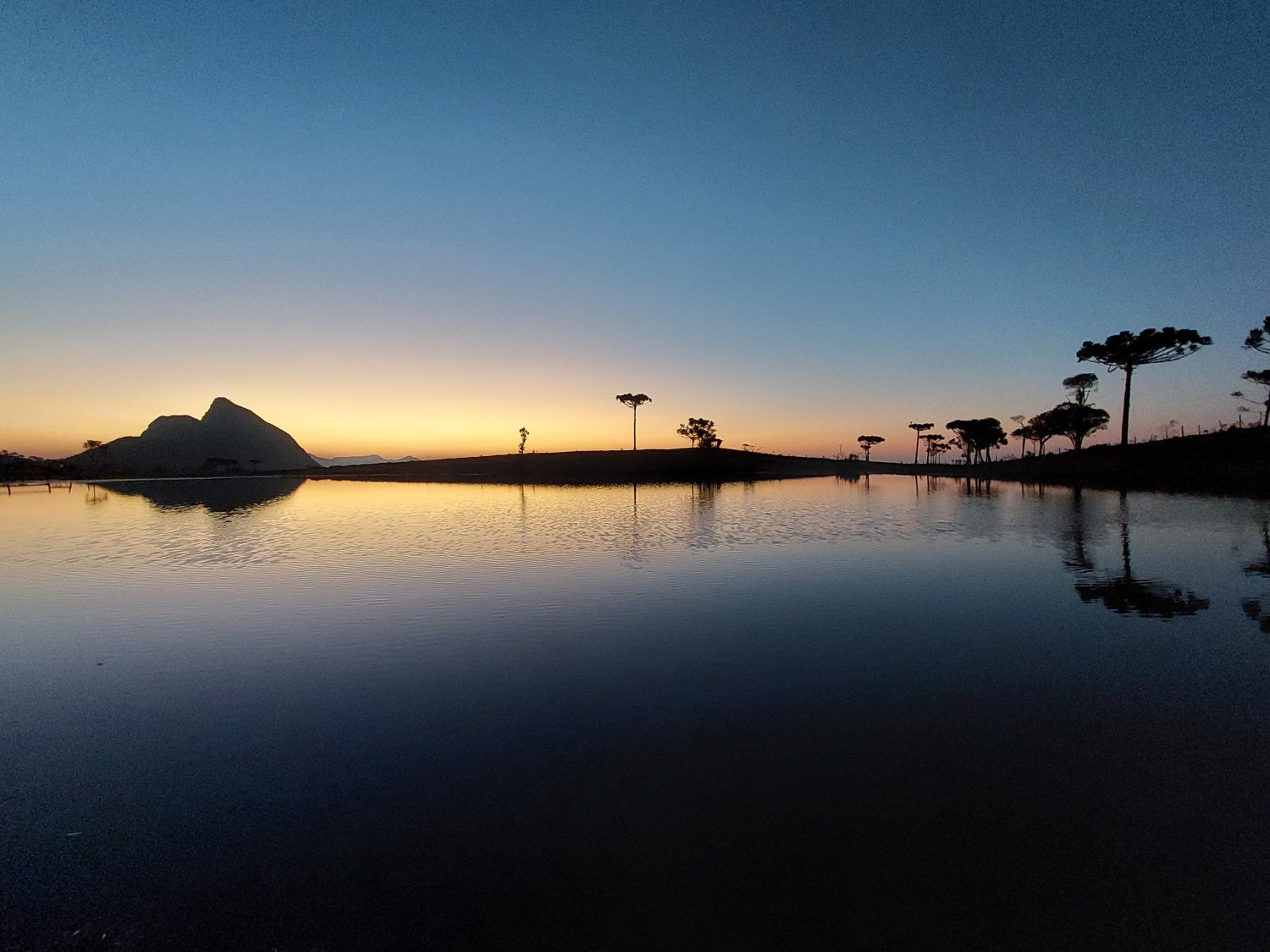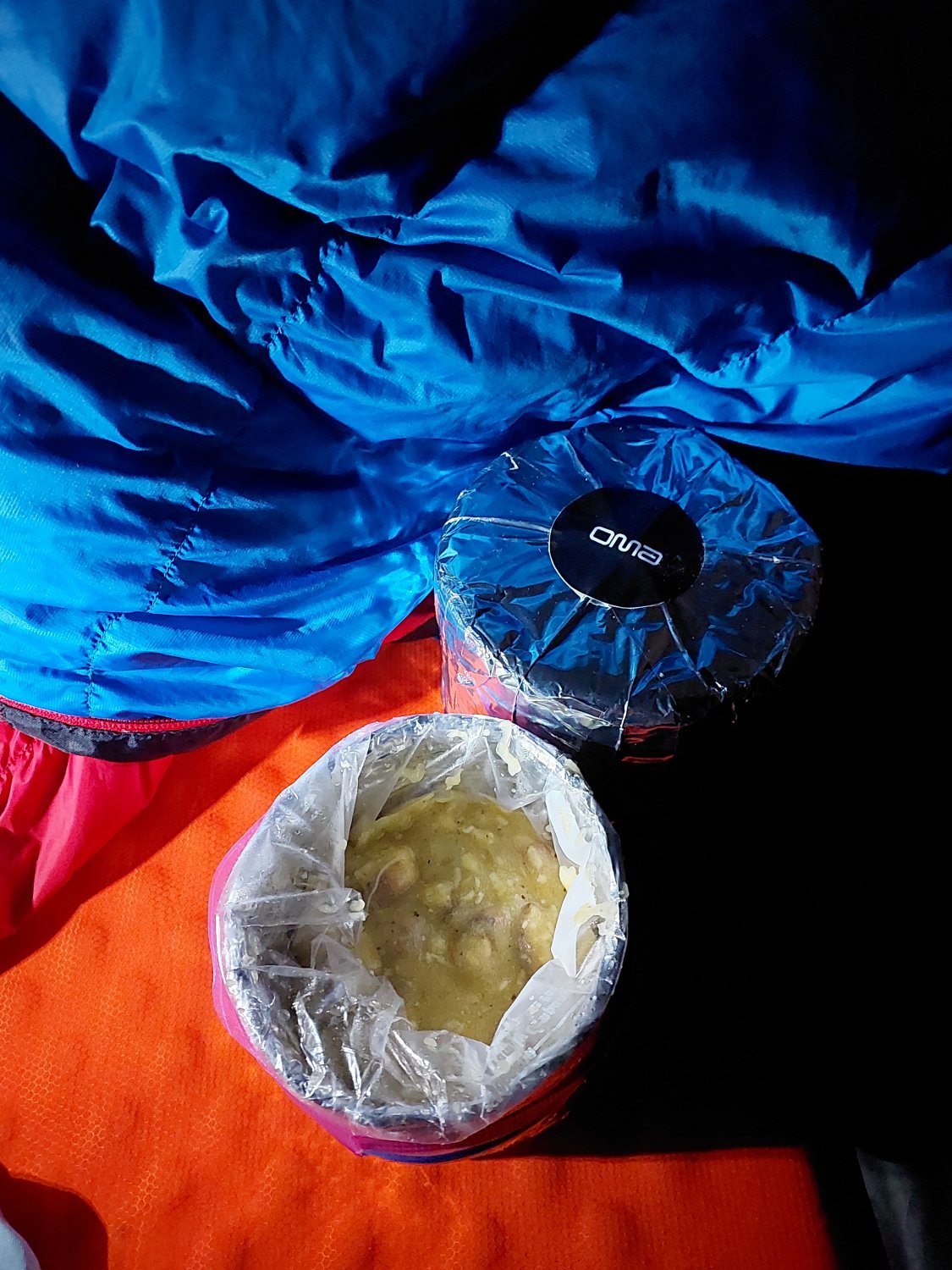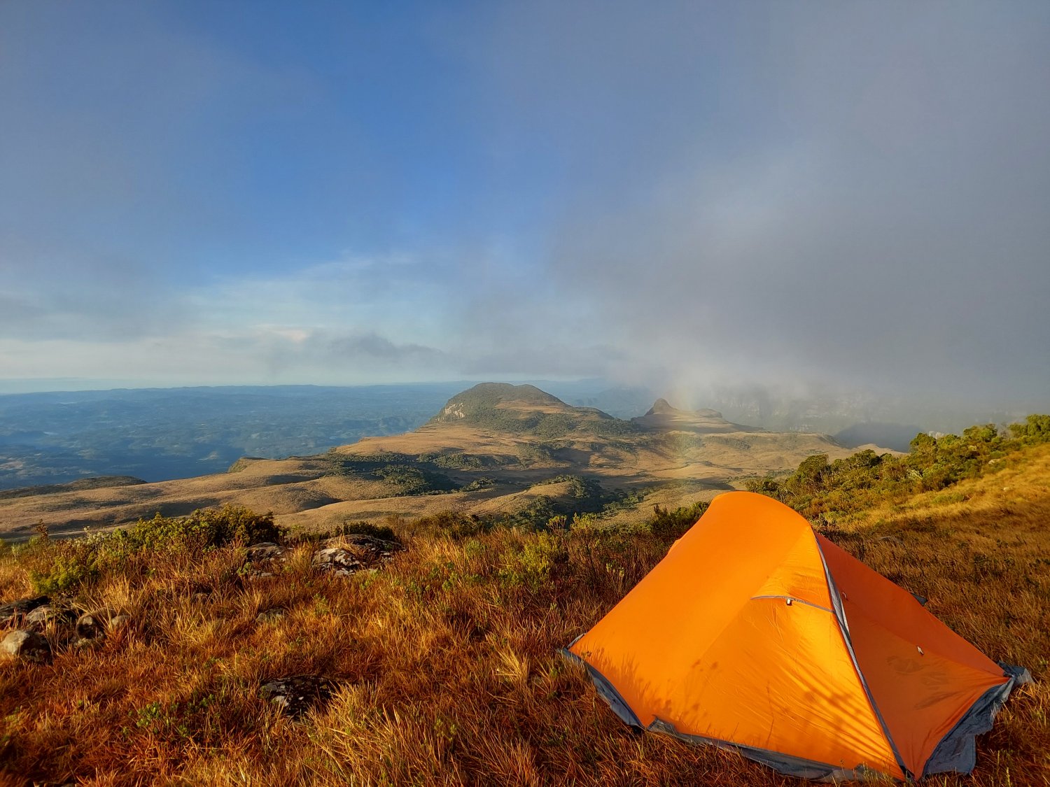 Depois de andar e procurar muito, encontro um local em que acredito no dia seguinte me renderia uma bela vista, se tivesse sorte e o tempo colaborasse. Já dentro da barraca organizo minhas coisas, deito um pouco no saco de dormir para me esquentar e acabo cochilando. Acordo um pouco depois e faço um café para comer com uma rosca de polvilho comprada mais cedo. Fico viajando dentro da barraca, pensando nos acontecimentos recentes da minha vida e a hora vai passando. Por volta das 21h saio da barraca para esquentar água para preparar minha janta e o céu limpou bastante, é possível ver as estrelas e as luzes da cidade na parte de baixo da Serra.