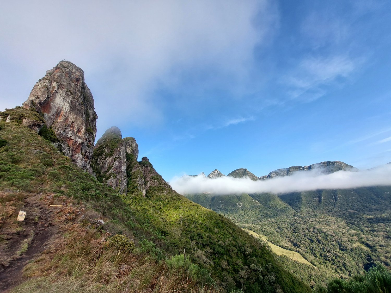A trilha segue pela lateral do estacionamento e depois imbica em uma estrada de chão por 1-2km. Na sequência saindo da estrada começa o longo trecho de subida, por meio de uma floresta de eucaliptos e depois por uma área de mata. No final da subida já é possivel apreciar uma vista. Desse ponto o caminho segue por uma área de campo nativo até sair novamente em uma estrada que só é possível acessar de veículos 4x4, quando em um determinado momento se faz uma curva e então é possível avistar os soldados. Na estrada se caminha por mais ~2km até chegar na portaria do parque. Registro feito, pulserinha no braço, hora de ir encontrar um local para acampar.
