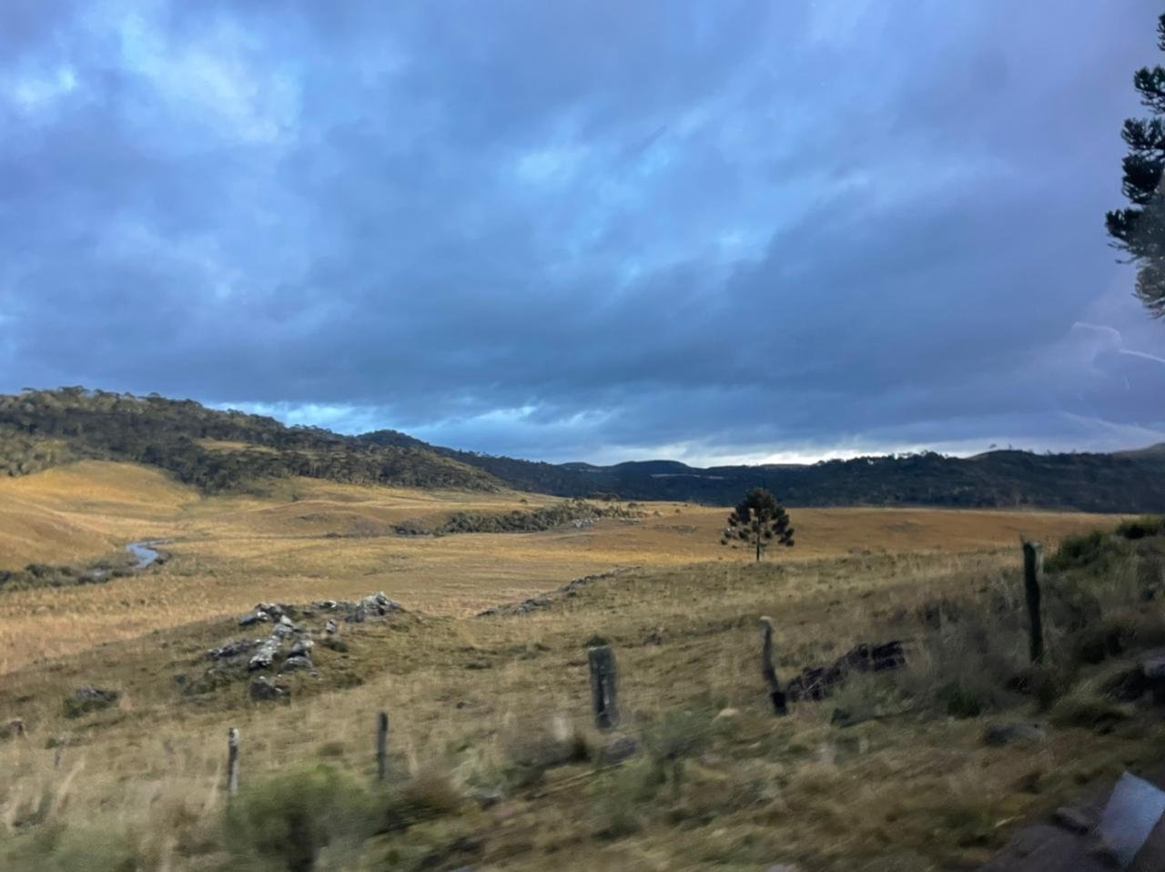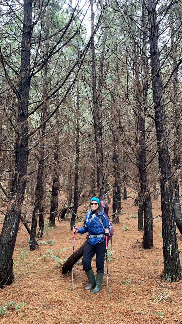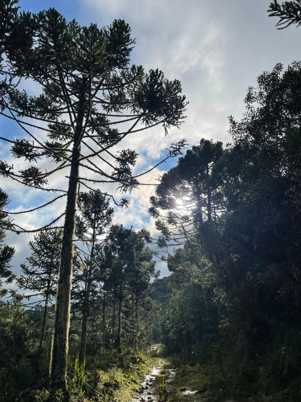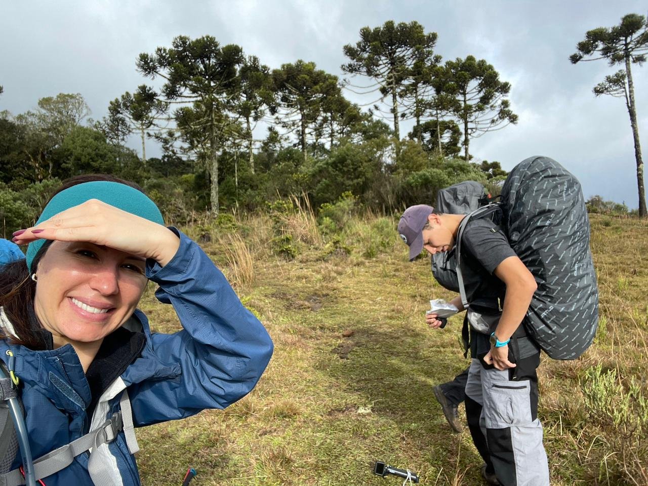 Antes do meio dia passamos por dois pontos mais difíceis, uma subida de reflorestamento que exigiu um pouco mais de esforço físico e outro ponto onde a navegação ficou um pouco confusa, mesmo com o GPS, acabamos demorando alguns minutos para encontrar o caminho certo. Quando terminamos de subir o reflorestamento e fazemos uma pausa para um lanche, levo um susto, meu celular começa a tocar e é minha irmã ligando. Instintivamente pensei que boa noticia não poderia ser, mas na verdade ela estava preocupada devido as fortes chuvas que causaram vários estragos em várias cidades do estado. Para nossa sorte, não pegamos um pingo de água de chuva na trilha.