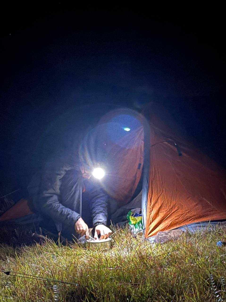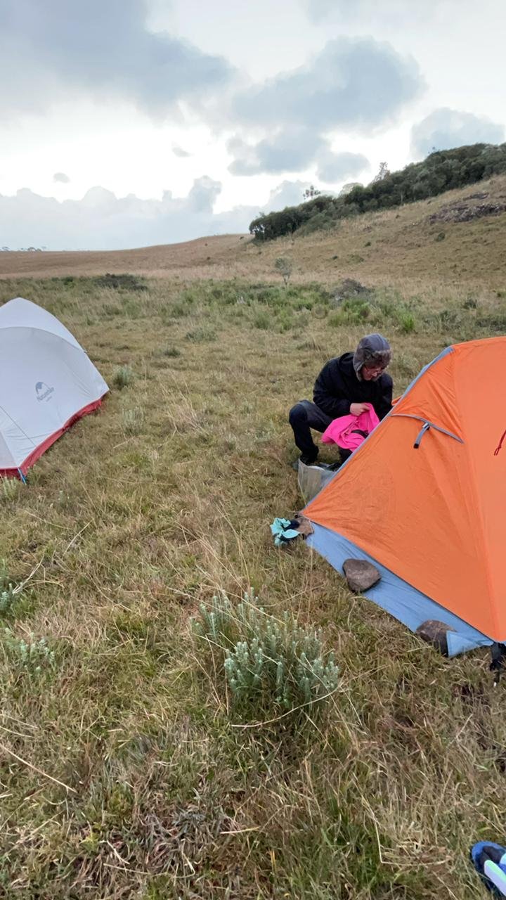 Acampamento montado, hora de preparar um café, trocar roupas quentes, tirar umas fotos e tirar uma soneca. Por volta das 19h abrimos uma garrafa de vinho que havia levado, para comemorar e compartilhar um bom momento entre amigos. O Leandro prepara um queijo colonial e uma copa lombo, um verdadeiro glamping!! ehehehhe. Secamos a garrafa de vinho, trocamos conversas, risadas e experiências, observamos um céu estrelado que há tempos não via e quando o frio bate valendo, cada um vai para sua barraca. Hora de preparar a janta, acabei levando pouca comida, tinha noção disso mas a falta de prática dos últimos tempos contribuiu para isso. Ainda em casa preparei uma paçoca de pinhão deliciosa, no acampamento só precisei esquenta-lá. Como minha janta com sangue nos olhos em pouquíssimos minutos. Escovo os dentes, lavo a louça e é hora de deitar. Eu e o Leandro, que pela praticidade optamos por dividir a barraca conversamos mais um pouco, olhamos umas fotos e nos ajeitamos para dormir.