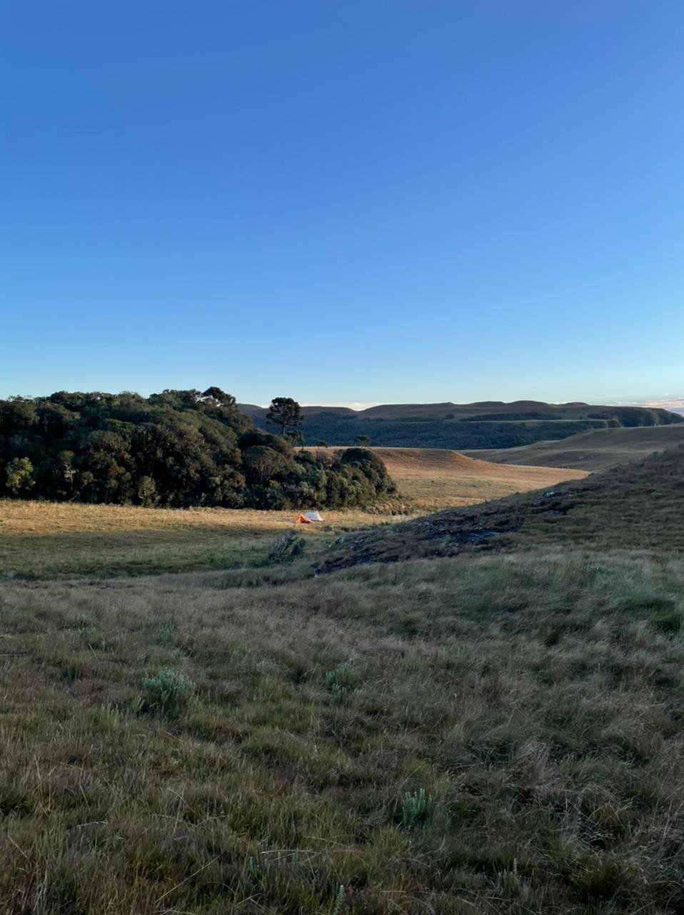 A Helô queria levantar cedo para ver o nascer do sol, eu também queria, mas sempre tenho muita preguiça de sair do saco de dormir e na maioria das vezes acabo perdendo o momento. As 6:00h da manhã meu celuar desperta, rapidamente desligo e me finjo de morto, ta uma friaca grande fora da barraca. Como ninguém se mexeu ou falou nada volto a cochilar. Com o saco de dormir que comprei da Helô e com algumas roupas novas de inverno me sinto pronto para encarar qualquer frio. E isso realmente aconteceu, foi a 1° vez que dormi bem e confortável em um acampamento, sem pés gelados, em alguns momentos até passei calor.