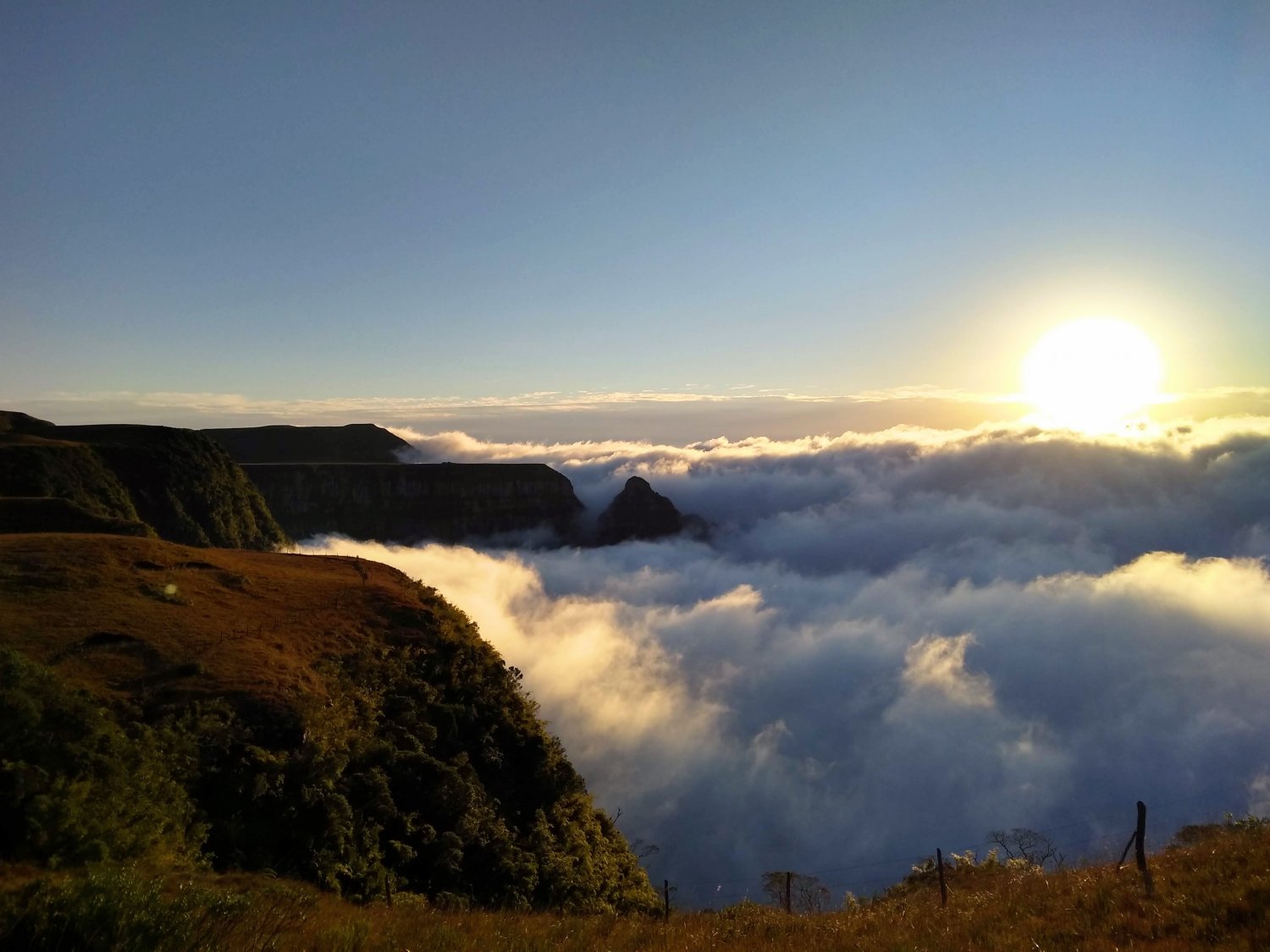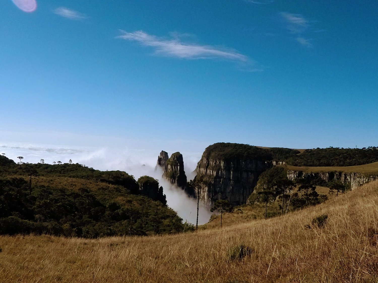 O vento, na direção oeste-leste por diversos momentos sopra forte e gelado, fazendo com que todas as nuvens fiquem aprisionadas na parte de baixo das paredes dos Cânions, criando uma sensação de estarmos caminhando sobre elas, uma sensação de paz, de bem-estar, de felicidade!