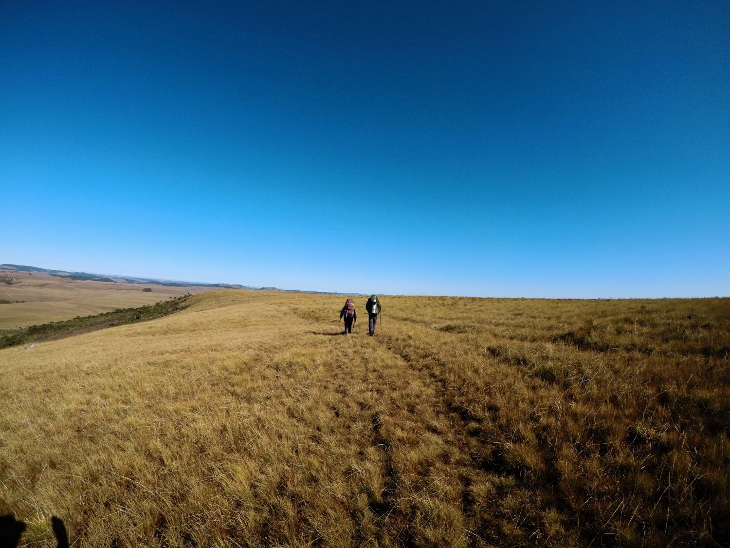 Haviamos planejado caminhar cerca de 12-15km no dia, escolher um bom local de acampamento com calma e ainda ter um pouco de luz do dia para aproveitar, ou seja, por volta das 15h, já que no inverno na região o sol se põe muito cedo. Por volta desse horário chegamos em um dos possíveis locais de acampamento mapeados, extamente antes do Campo de Pouso, deixamos nossas mochilas e vamos explorar o local para escolher o melhor terreno, abrigado do vento, o mais seco e plano possível e perto de algum ponto de água.