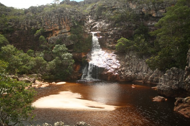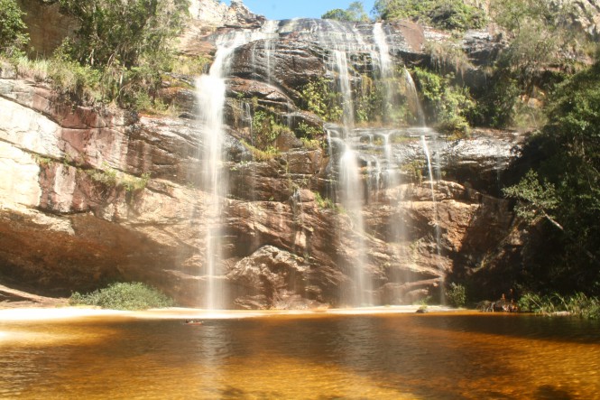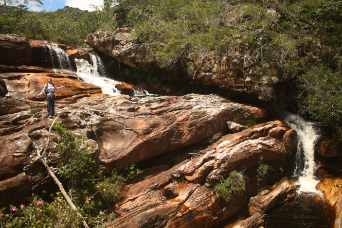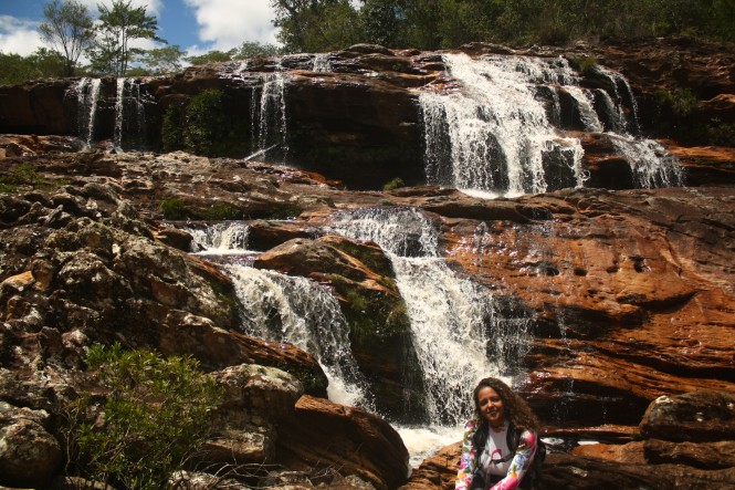 Iniciamos por uma trilha sem definição e pouco visitada, mas que já apresentava um lindo visual. Logo no início já tivemos de recorrer aos mapas para confirmar o caminho, poucos tempo depois já escutamos o barulho da cachoeira Maria Bruna, muito bonita possui duas quedas d’água, mas o que mais me encantou foi que parte de sua queda percorre por dentro das pedras formando no fim uma pequena corredeira ao fundo da queda principal. O poço é grande mas em sua maioria raso, mas a parte funda era suficiente para um bom banho e se refrescar. Não ficamos muito tempo por lá pois tínhamos ainda muito o que percorrer.