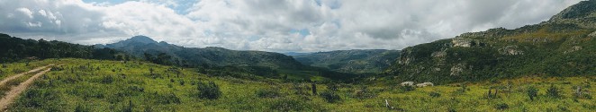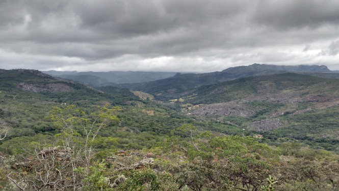 Uma trilha batida mas estreita até chegamos ao alto do morro de onde avistava o vale do Rio Manso no meio de duas serras muito bonitas, a esquerda a acaba saco e a direita a serra do crioulo. Descemos ao vale passando por Campos de gramíneas e rochas, lugar típico da serra do espinhaço. Por volta das 12:34 já nos encontramos na estrada de carro que dá acesso a fazenda que fica numa região apelidada de Flitz. Daí para frente mais poucos quilômetros nos separava de nosso destino, a Fazenda das abóboras. Chegamos lá às 13:43 bem antes do previsto e logo fomos convidados a entrar e tomar um café e produção mais um pouco.