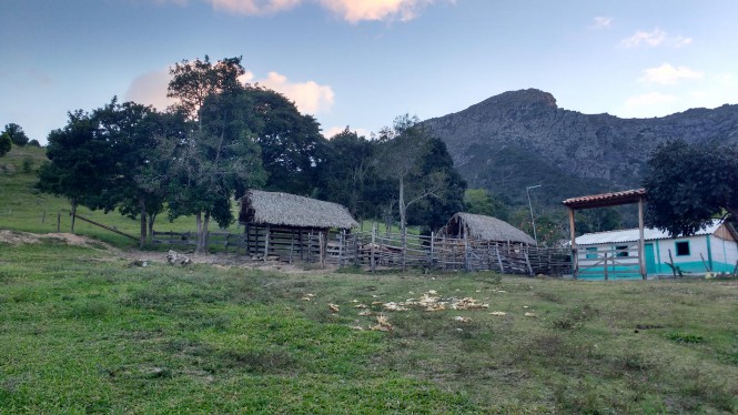 Logo a frente seguimos pela estrada de carro e pegamos uma verdadeira ribanceira, fiquei embasbacado como uma carro pode descer ou subir aquele caminho. Seguimos margeando o córrego Bica D’água, passando por algumas casinhas. É interessante o quanto esta região foi esquecida, as casinhas de adobe, com placas solares como opção de energia, e algumas algumas vaquinhas.