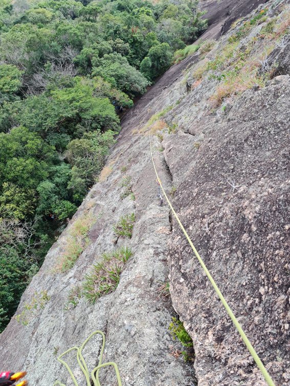 A terceira cordada tem um esticão considerável, algo entre 10 e 15 metros, numa graduação não tão óbvia assim, já que ela segue toda em aderência, com poucas agarras. Sem pensar muito fui tocando tranquilamente, satisfeito com minha calma. Na sequência Fernando subiu e emendou guiando a quarta cordada. Agora a sapatilha já começava a apertar, principalmente no calcanhar, e o calor crescente piorava a situação, mas nada que preocupasse a conclusão da via. Subi de segundo, emendei a quinta cordada, um lance bem prazeroso entre agarras pequenas, grandes, e aderências, e estiquei o restante da via, chegando no cume por volta das 15h. Dali encaixei um friend pequeno em uma grande laca e dei segurança para o Fernando. No total levamos 2h20 do chão ao cume, nada mal, considerando que era a segunda via tradicional do dia. Somando ambas, foram praticamente 5 horas em 10 cordadas.