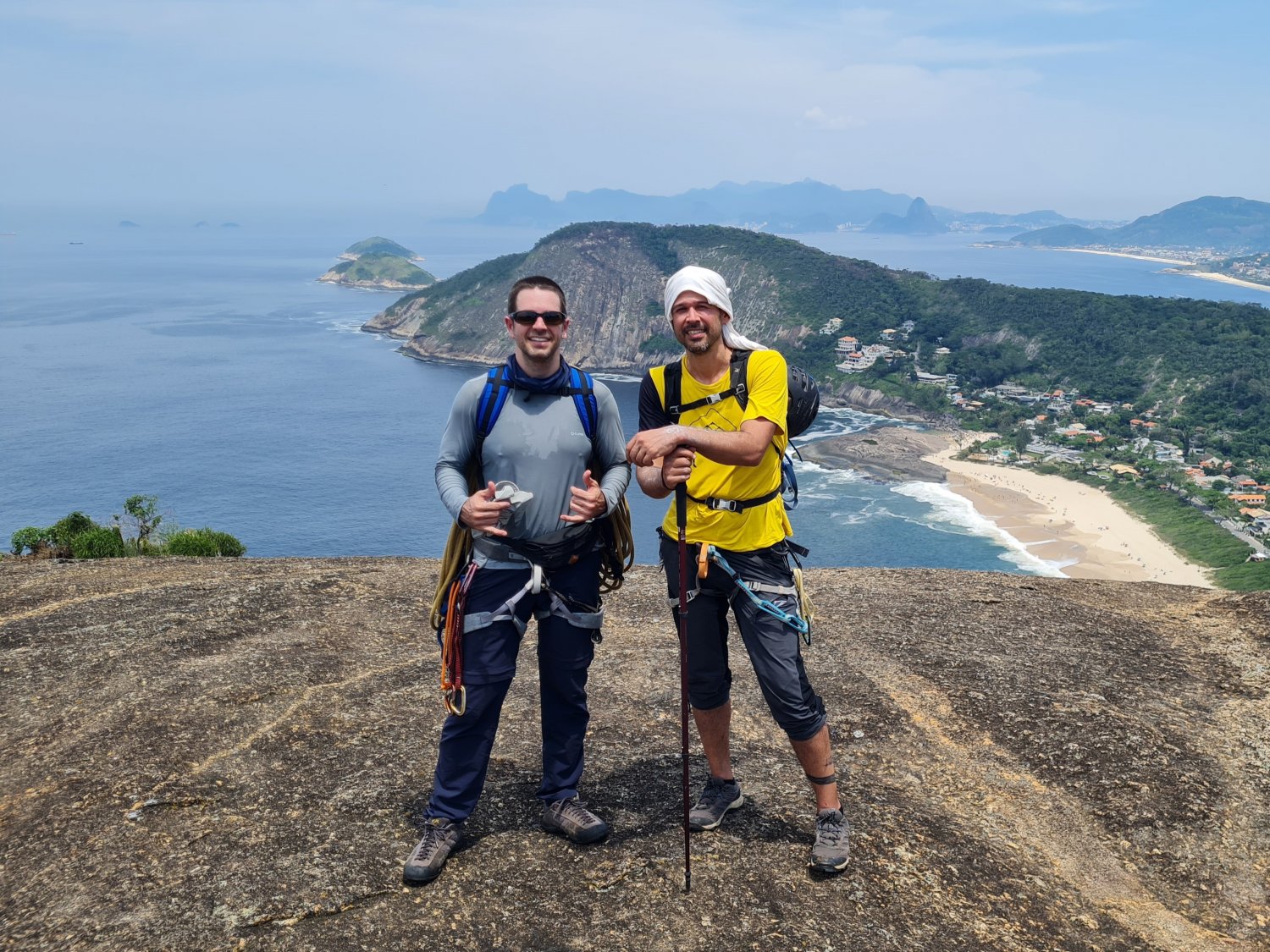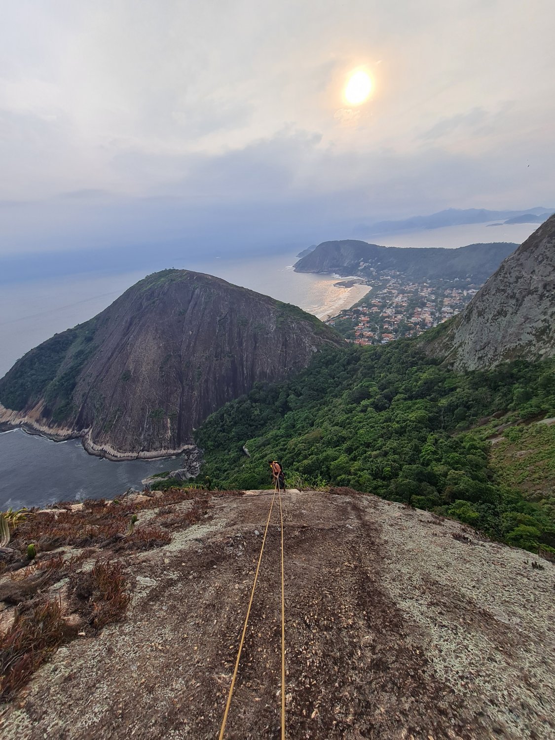 Por volta das 15h o Machini iniciou a guiada que partia do platô, mais um belo trecho, com crux de IV grau e poucas proteções. Sem problemas ele chegou na parada e eu segui, já emendando o próximo trecho, um pouco mais fácil. Por fim, o Machini guiou a última parte, chegando no famoso cume pouco depois das 16h. Diferente de todos cumes que já estive, esse tem uma aresta pontiaguda, e não tem como ficar de pé, só sentado, ou com um pé de lado, parece saído de um desenho. E a vista? Indescritível! Praia, montanhas, mar, vegetação, área urbana, tudo junto e misturado. Ainda tivemos a sorte de ter uma boa visibilidade pra apreciar e registrar a paisagem.
