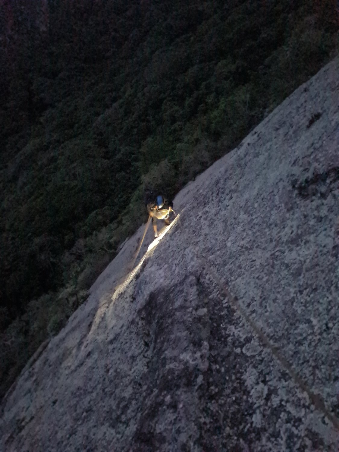 Machini veio na sequência e acendemos os headlamps, já estava totalmente escuro, era noite, por volta das 18h30. Deixamos uma malha rápida neste grampo solitário (para facilitar a puxada da corda depois) e o Machini começou o rapel que seria o mais importante. Não sabíamos se a corda chegaria até a próxima parada dupla (a P1), além disso, é uma descida bem diagonal, o que é sempre chato e trabalhoso. Enquanto ele descia cautelosamente, estava apreensivo, torcendo pra chegar logo, e para não cair uma chuva naquele momento crucial.