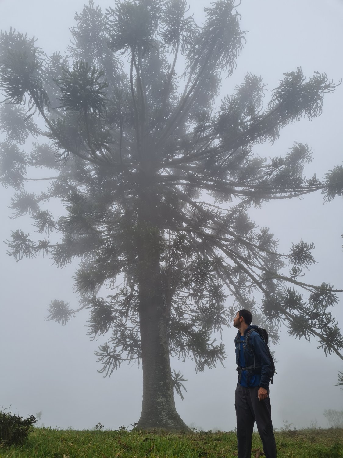 Após uma noite com vento e a neblina fazendo as árvores pingarem em cima de nosso teto, acordamos as 4h da manhã, e o Fernando acendeu o fogareiro na cabana para tomarmos um café. Iniciamos a trilha às 5h na Araucária, mais 45 minutos de trilha, ainda bem úmida.