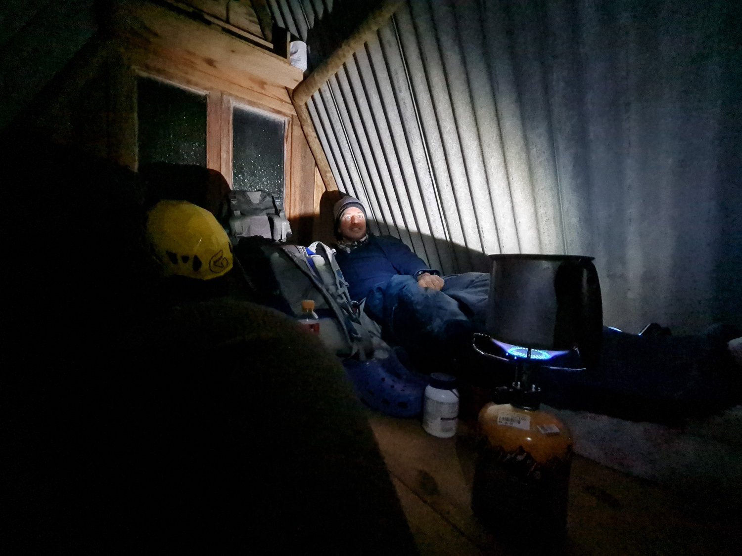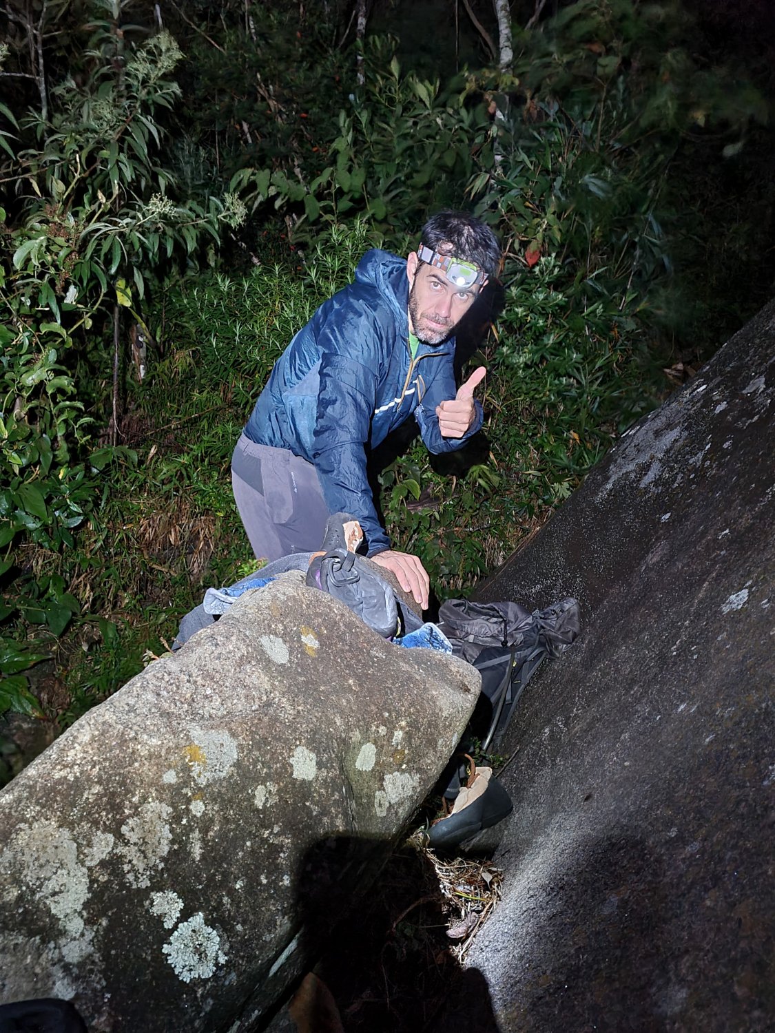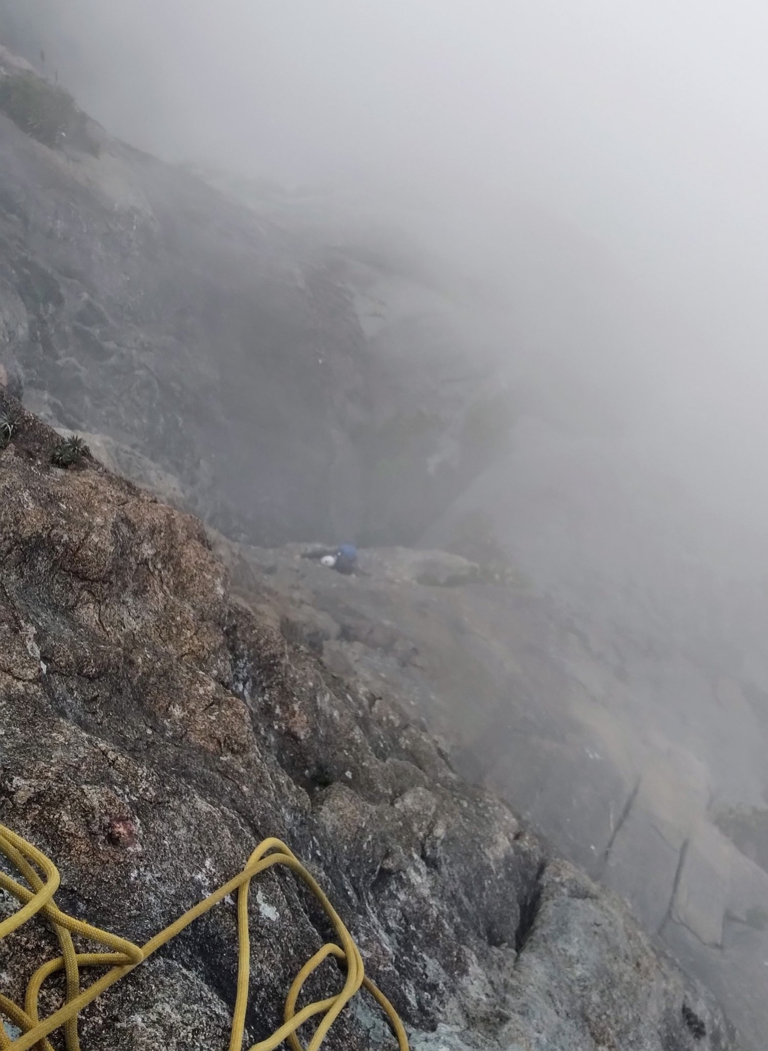Na base da via descansamos e analisamos o que dava. A rocha estava levemente úmida, mas “escalável”. A névoa pairava sobre toda a montanha, mas não havia sinal de chuva. Guardamos as duas cordas (a principal de 60m, e a corda mais fina para eventual abandono de via se fosse necessário) e as ferragens (costuras, mosquetões) dentro de um saco de lixo amarrado e deixamos escondido para o dia seguinte. Voltamos rapidamente, e às 15h30 estávamos no abrigo, prontos para organizar tudo para o dia seguinte. Uma macarronada na cozinha do acampamento e às 18h30 entramos na cabana para dormir. Vale notar que ao escurecer, com a uso da luz do headlamp, ocorria algo que nunca tinha presenciado: era praticamente impossível enxergar 2 metros pra frente devido ao gotejamento aéreo. A nebline era forte e as gotas de água ficavam suspensas no ar, refletindo a luz da lanterna. Foi nesse ambiente que dormimos, torcendo para que, pelo menos, não chovesse, e fosse possível escalar com um mínimo de segurança.