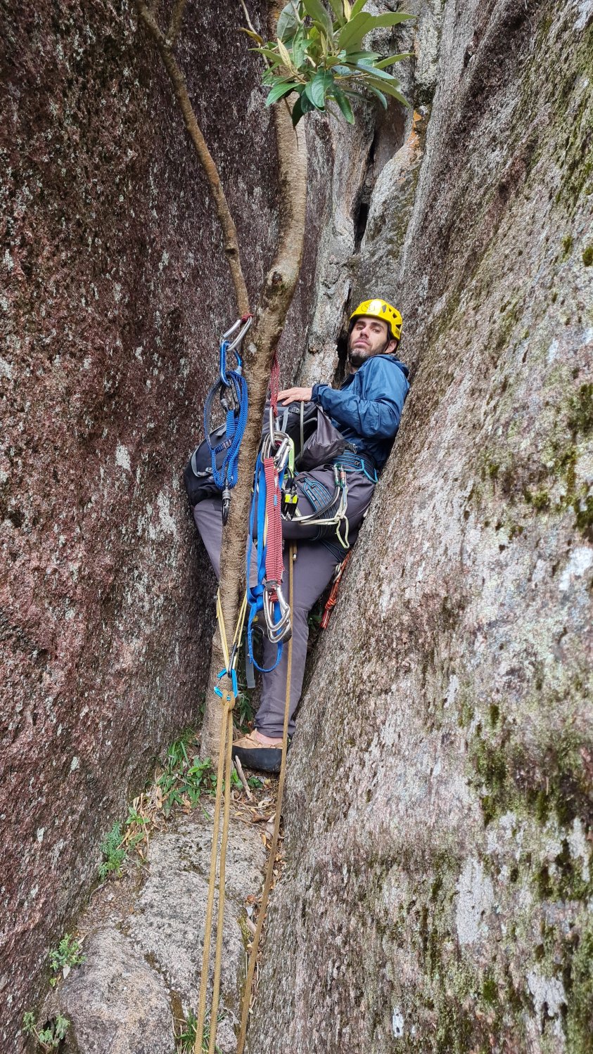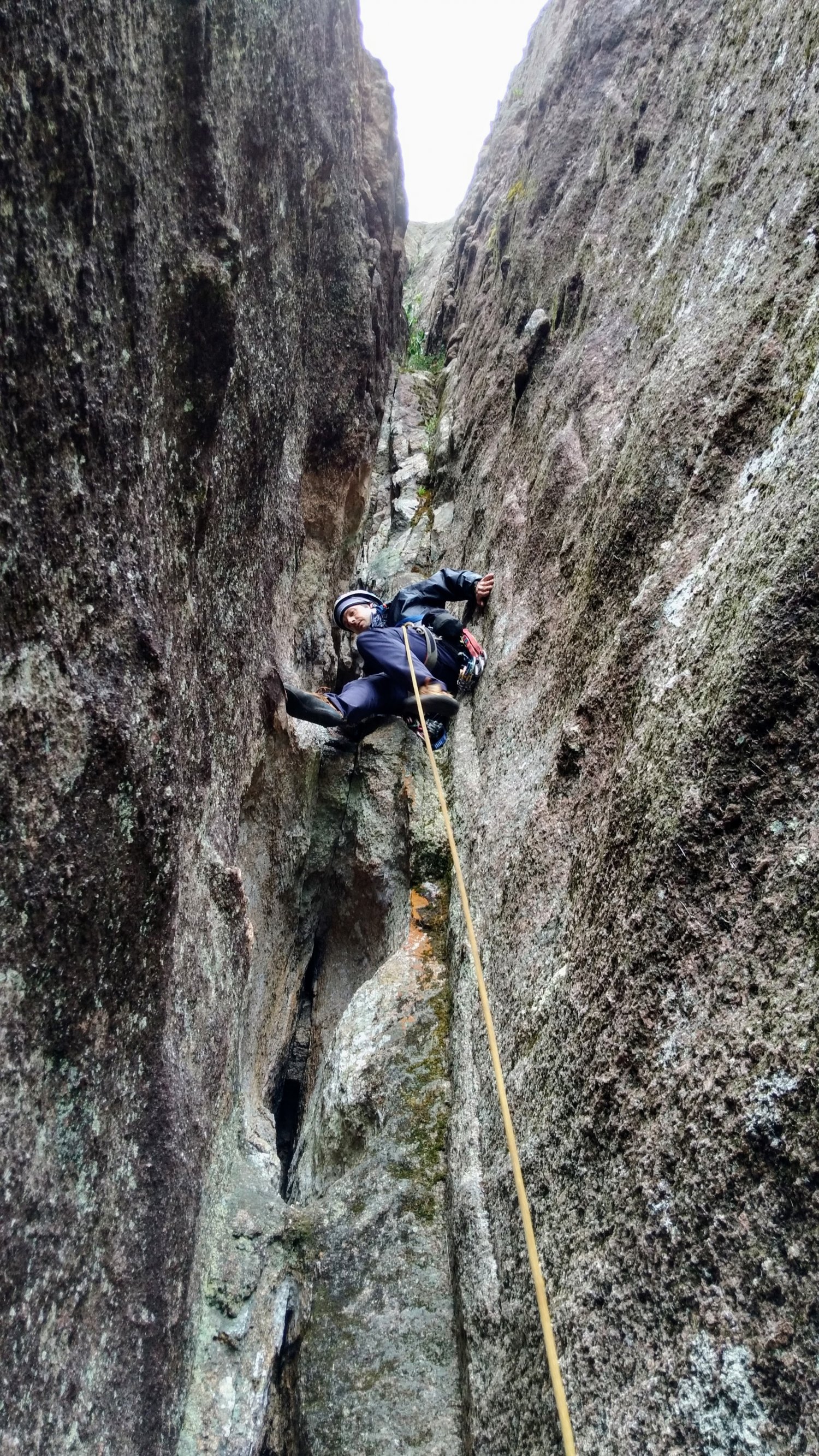 A cordada seguinte seria guiada pelo Fernando, mais um longo trecho, que se inicia num lance vertical de uns 10m com uns abauladões, chega num platô e daí em diante não é possível ver mais o guia da parada. Só sabia que este trecho tinha a famosa segunda chaminé mais acima, uma chaminé exposta, sem proteções, mas que diziam ser tranquila e perfeitamente simétrica. Enquanto eu assegurava o Fernando não imaginava que ele estava ali, mais de 20m sem proteção, no meio da chaminé, fazendo um vídeo com o celular tranquilamente. Após ele chegar na parada já fui subindo,e o lance dos abaulados, que parecia fácil da parada, não foi tão simples. Chegando no platô acima vi a imensidão da chaminé, mas ainda tinha que encarar uns 10m de uma fenda na lateral da parede direita, bem larga e vertical. Subi do jeito que deu, com mais esforço do que técnica: não conseguia entalar o pé adequadamente para ganhar altura e nem usar a parede lisa, à esquerda da fenda, pois não tinha agarras. Esse trecho já foi cansativo, e quando entrei na chaminé o cansaço só aumentou. Pouco mais de 20m com poucas agarras para pé. Eu escolhi entrar virado para a direita, enquanto o Fernando tinha entrado para a esquerda. Geralmente uma chaminé tem um lado mais “fácil” que outro, não sabemos qual era o caso desta, pois vi vídeos e fotos de escaladores usando os dois lados. De todo modo, após a metade eu já estava cansado, somando com o esforço do dia e a falta de vivência nesse tipo de lance. Na saída na chaminé ainda há um lance vertical de agarras, não muito boas, e ali usei o tanque reserva para chegar na parada. O cansaço bateu mesmo.