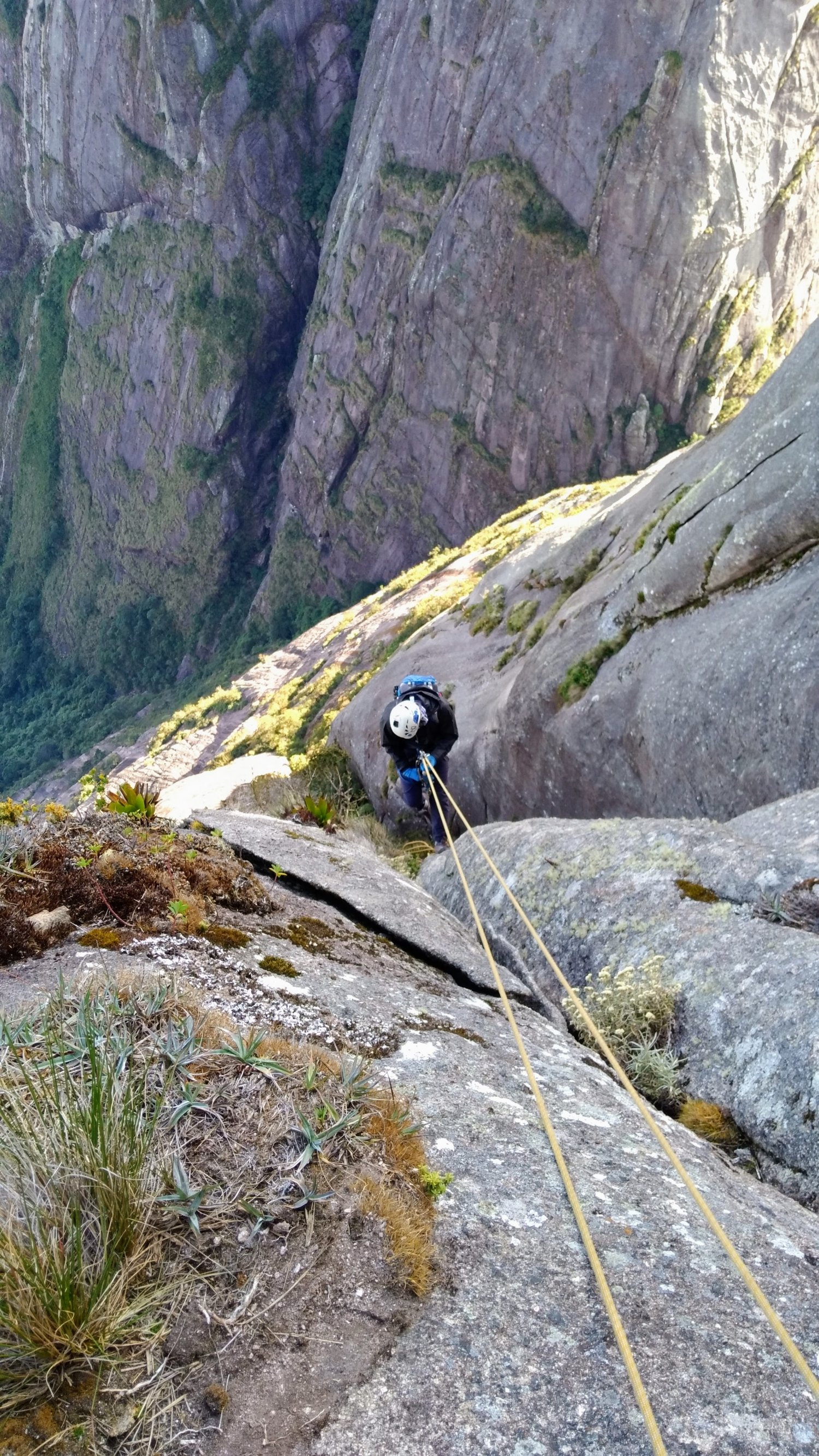 Fui e voltei duas vezes em dúvida, ninguém queria se arriscar a descer por ali. Após alguns bons minutos perdidos pensamos “não é possível que seja por aqui”. Voltei mais um pouco, até onde a trilha anterior encosta na pedra da montanha, e encontrei um caminho bem estreito de mato pisado, colado à rocha, seguindo para a esquerda. Desconsiderando a rota suicida onde o Fernando se encontrava mais abaixo, o chamei para me seguir, e fomos indo por essa trilha, bem mais estreita, mas menos arriscada. Mais uns 5, 10 minutos e chegamos em uma parada dupla, fazendo um curto rapel. Este não era o rapel da P1 para o chão, e não sabíamos que havia esse rapel intermediário, mas seguimos mesmo assim. Poucos minutos de mais trilha vertical e finalmente achamos o último rapel que faríamos: a P1 da Sylvio Mendes, que caia direto para a terra firme, no col que separa o Pico Maior do Capacete (procuramos a famosa árvore maior do col, sobre a qual o livro de guia das 50 vias clássicas do Brasil comenta, não tínhamos certeza qual seria, mas isso não foi problema, a trilha estava óbvia ali).