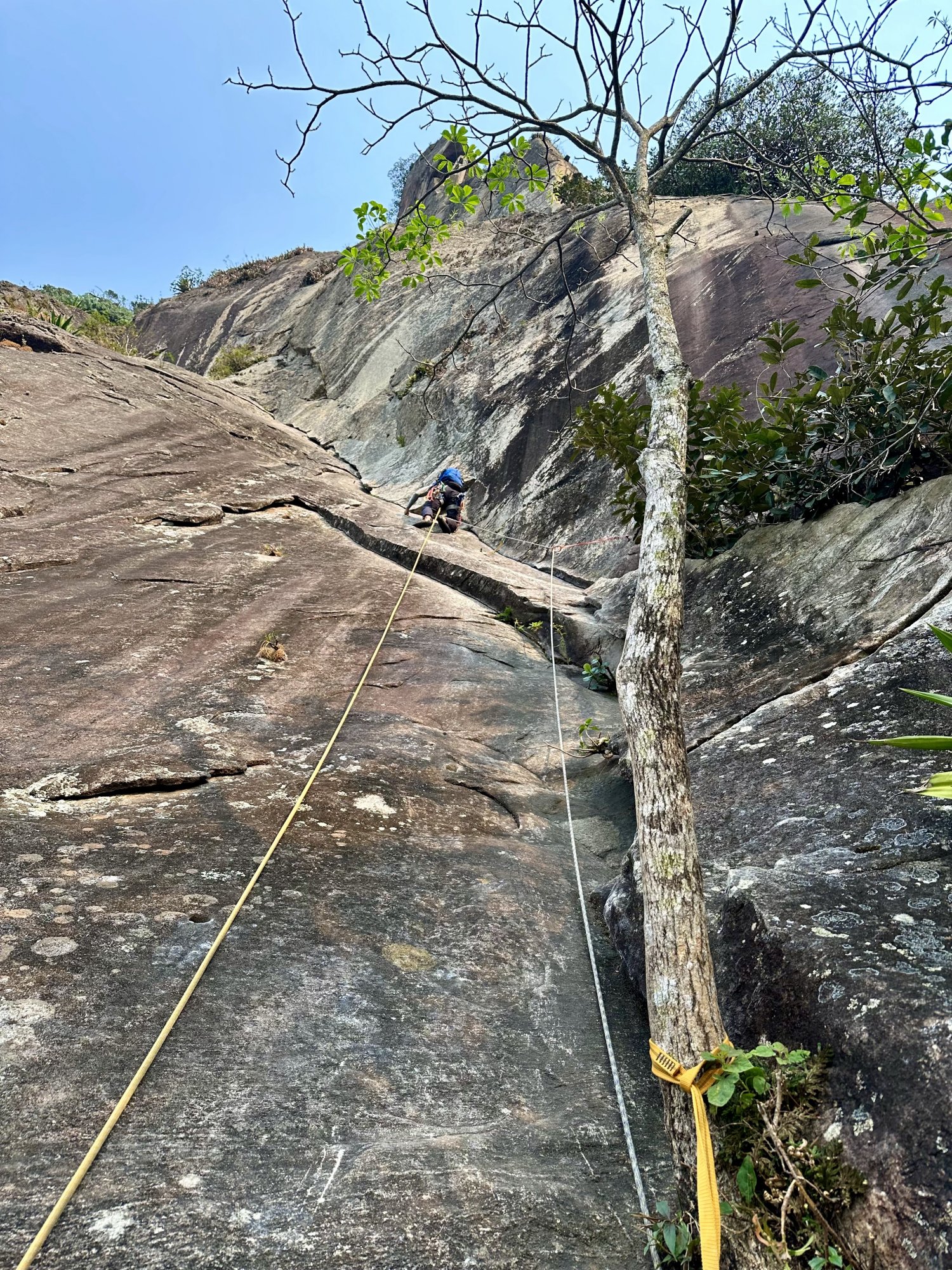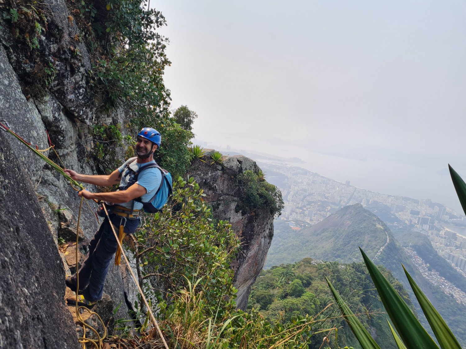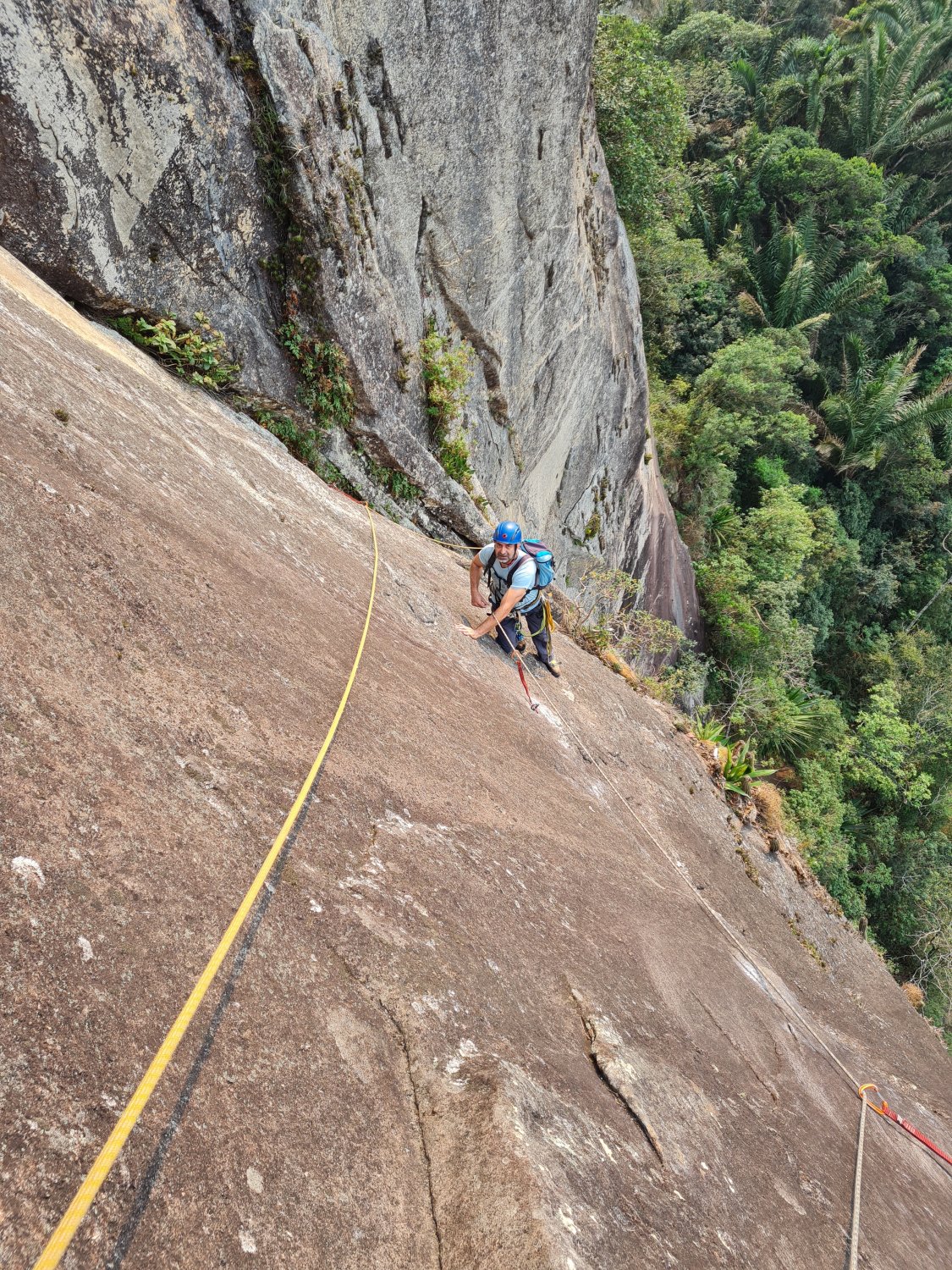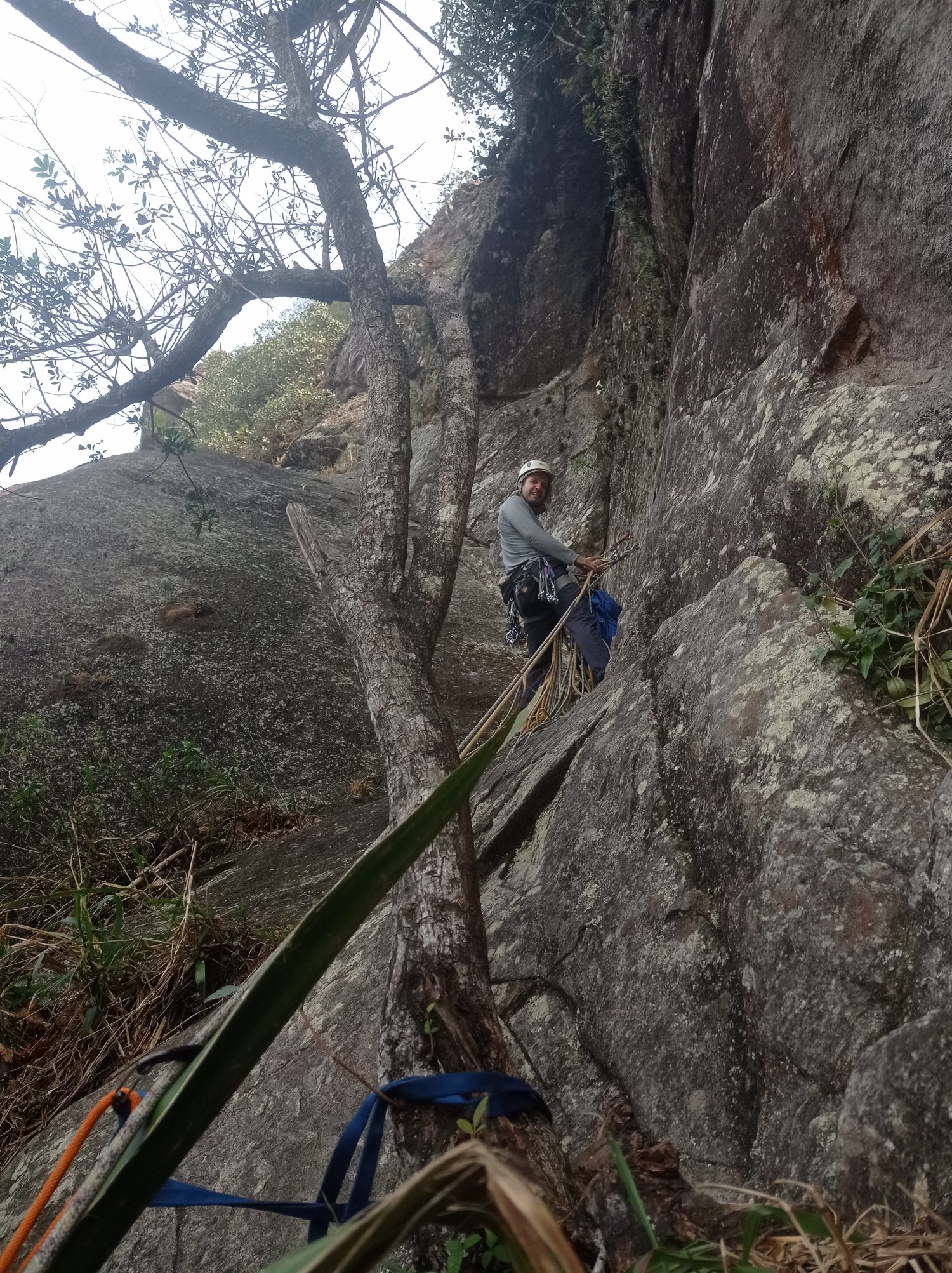 Enfim, encontramos uma via bem protegida que parecia legal, algo em volta do IV grau, e decidimos escalar ali. Dessa vez o Nelson resolveu subir primeiro, guiando. Como já estava tarde resolvemos só fazer a primeira cordada mesmo. Assim que ele desceu da via o famoso escalador solista apareceu. Trocamos uma idéia e assim que ele falou o nome, Antonio Paulo, lembrei que o seguia no instagram, e que ele abrira diversas vias Brasil afora desde os anos 80. Infelizmente só fui lembrar que ele era o escritor do livro “A Escalada Brasileira” no dia seguinte. Eu tenho esse livro há algum tempo, e é excelente! Já fica aqui a recomendação. Depois de todos escalarem a via que o Antonio Paulo disse acreditar ser a “Vilma Arnaud”, voltamos em direção à entrada. Ainda escalei mais uma cordada de outra via (Ricardo Prado, creio), curtindo um som que vinha lá de baixo, da base do bondinho, e fechando um dia bem proveitoso.