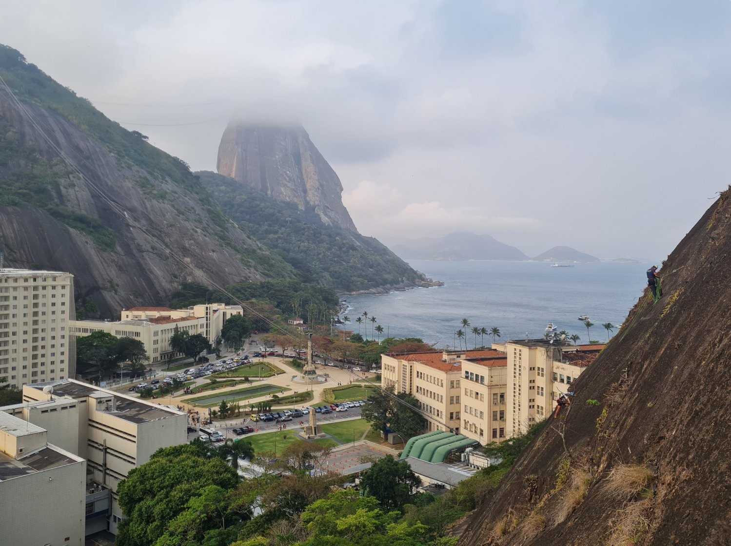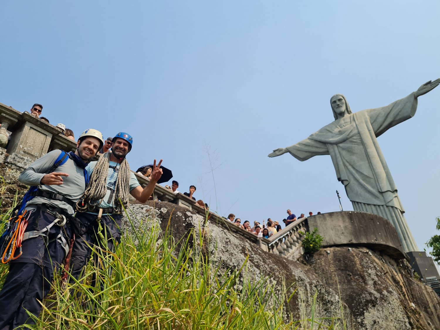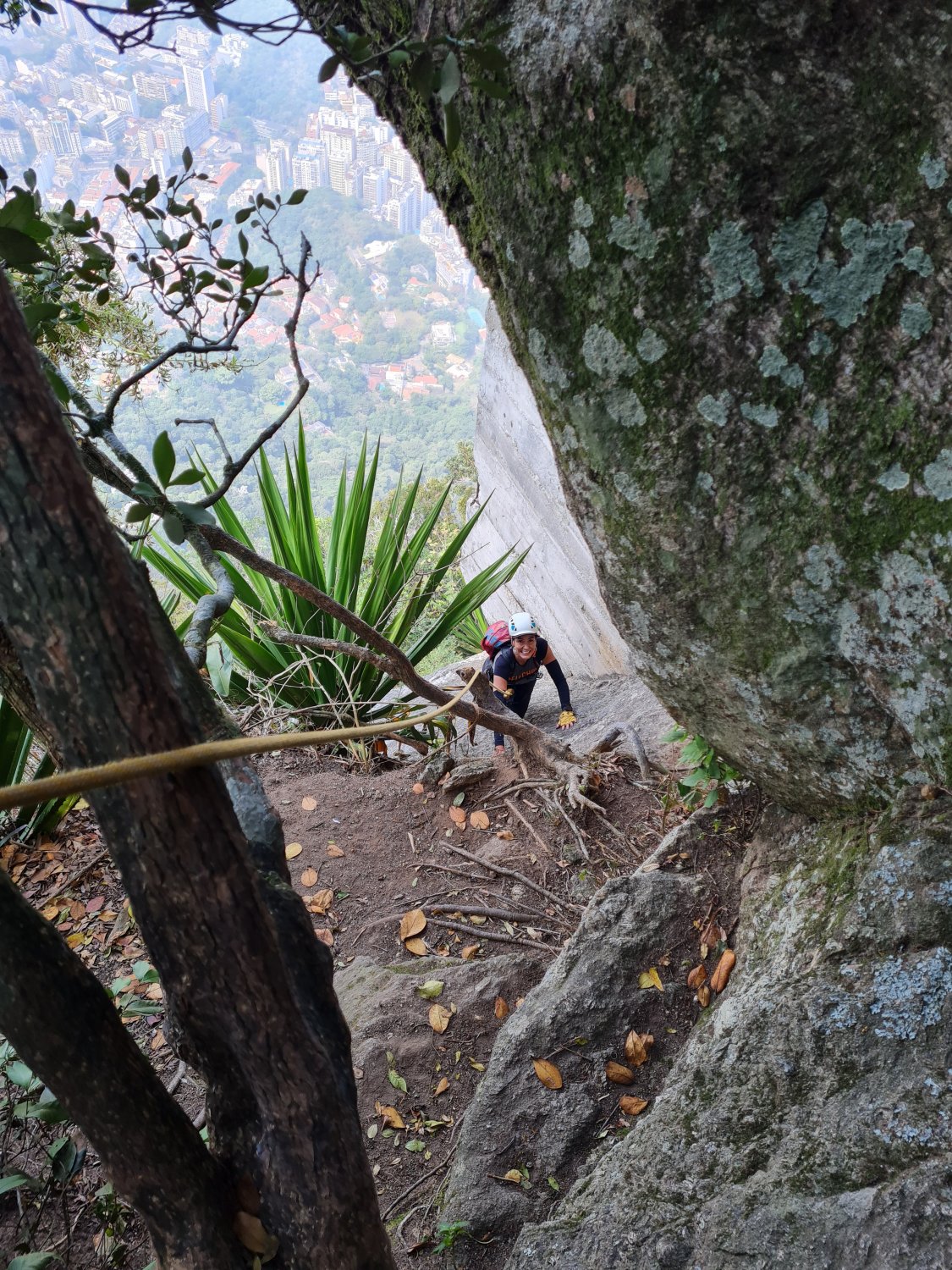 Todos na parada e rapidamente já iniciei a última guiada, um lance de 20m abaixo de uma grande contenção de concreto, mais vertical que os demais e com pequenas agarras, ou aderência. Primeira chapa um pouco alta por sair de um platô, mas sem problemas de se alcançar. O crux se dá logo depois, e tive que dar uma puxadinha na costura para me equilibrar e ganhar o lance, que não é tão fácil. Depois já facilita e a pedra dá lugar à terra, onde se faz a parada em uma árvore (algumas são frágeis, a mais segura fica à direita no platozinho). Cheguei ali às 11h45, totalizando exatas 3h desde que iniciei a via. Tempo bom, considerando a cordada em 3. Meia hora depois chegou a Gina, última da cordada, somando assim 3h30 no total. Agora era só andar uns 15m e pular o parapeito da base do Cristo Redentor.