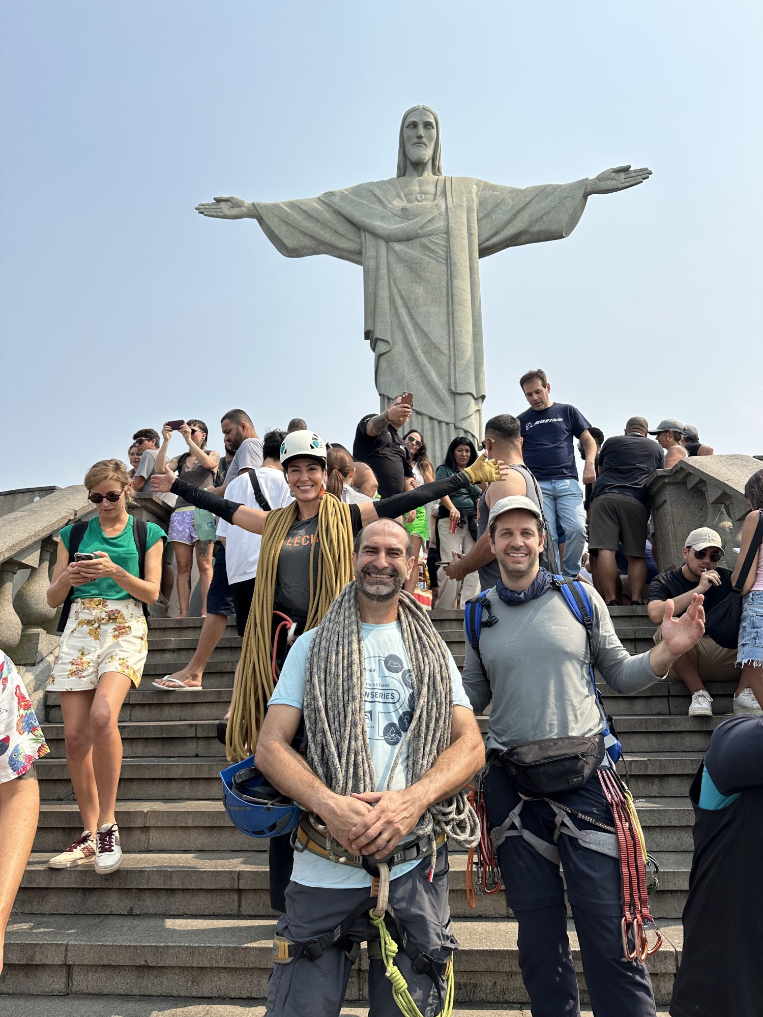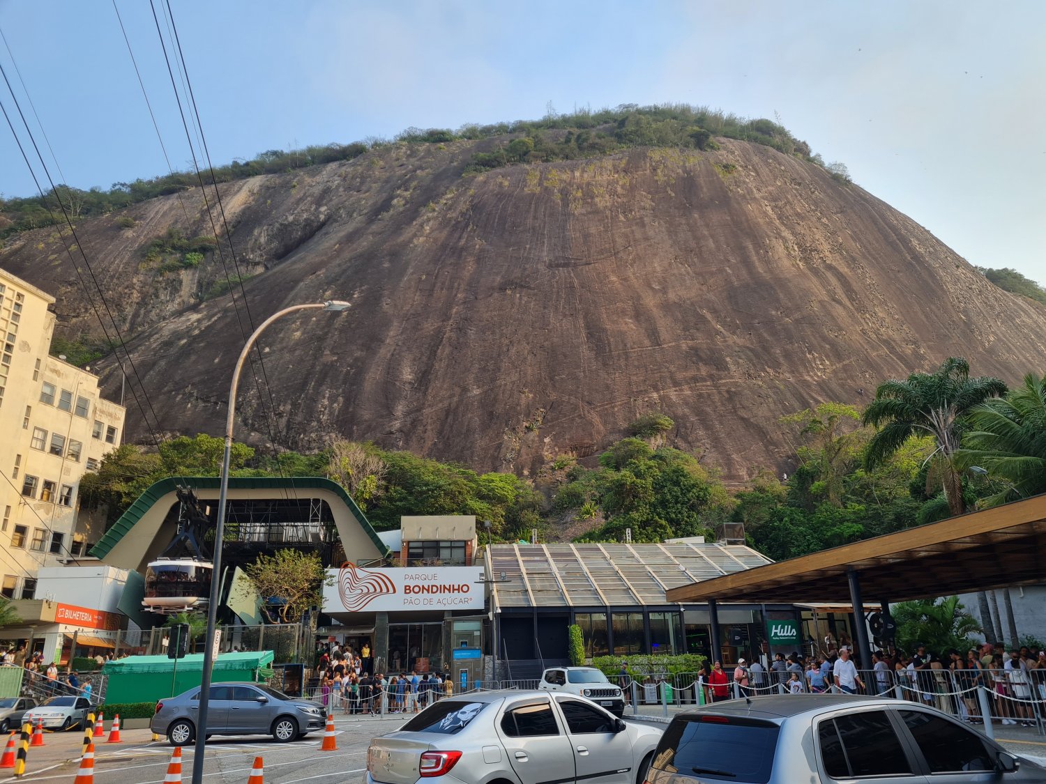 Chegando no ponto turístico aquela reação natural das pessoas olhando para três escaladores vindo sabe-se lá de onde. O lugar estava lotado! Mal havia espaço para pular o parapeito. Tiramos fotos, demos uma olhada no visual e descemos com a van (de graça, pois os escaladores “merecem” rs). Dali fomos direto almoçar nas Laranjeiras, e partimos para o segundo tempo: morro da Babilônia na Urca.
