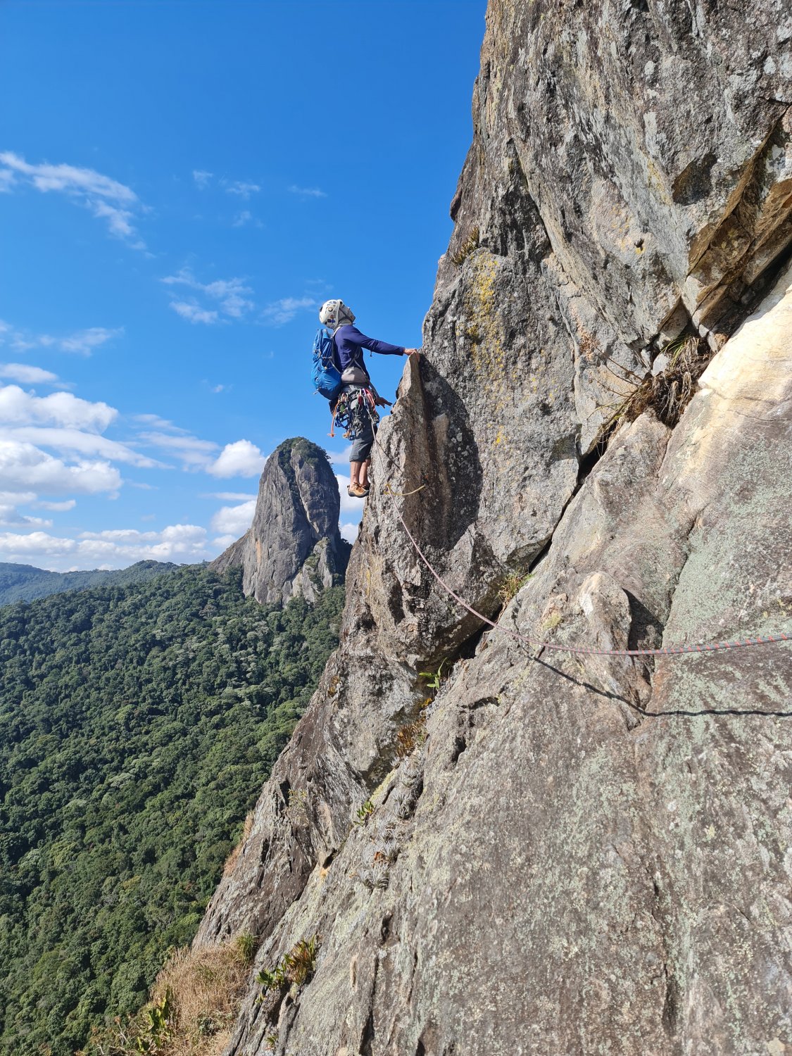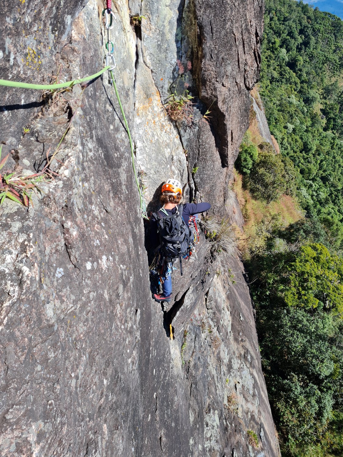 David logo chegou, agora com o psicológico mais descansando para voltar a guiar. A via da vez era a Learning to fly. Via toda em móvel, que normalmente é feita em duas enfiadas, vinda do Col do Baú. Porém, como estávamos na parada da Gregos e troianos, era possível fazer em uma enfiada só, de uns 45 metros. Deste ponto ela sobe até uma fenda/teto horizontal, até chegar no grande diedro. Dali há um belo lance em agarrões, e mais fenda, até chegar numa fenda mais vertical, onde se deve fazer movimentos de diedro mesmo, em tesoura, com pernas bem abertas. Felizmente tenho treinado flexibilidade de quadris, e os lances saíram com naturalidade. Ela continua bem vertical, o pé esquerdo especialmente vai bem chapado, e então o crux: uma virada para a face direita bem delicada. A via continua com uma movimentação difícil até o fim. Consegui subir sem quedas ou descanso, e àquela altura os dedões do pé já começavam a latejar. Pelo menos agora teria um refresco.