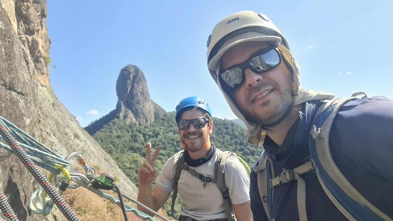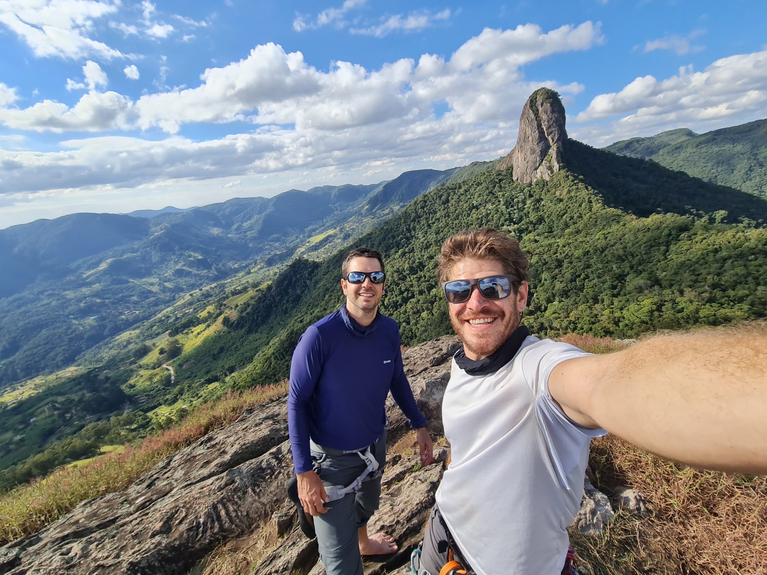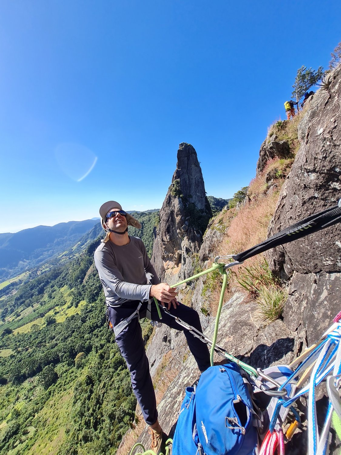 O Fernando veio bem, só teve dificuldade na vertical final, mas logo eu já estava guiando a última cordada. Aquela pausa estratégica na aresta para tirar a foto com o ângulo mais lindo do complexo do Baú (na minha opinião), e então o crux final: novamente um trecho perfeitamente vertical com poucas agarras e alguns abaulados. Quando fiz a Elektra da primeira vez, estava de segundo nesta parte, e me lembro que não era de graça mesmo, dessa vez estava curioso para saber se tinha evoluído a ponto de passar com tranquilidade. Bom, não foi um passeio, tampouco desesperador, mas bem na hora surgiu um helicóptero da PM perto de onde estávamos e tirou um pouco da concentração. Só não queria que eles testemunhassem uma queda! Fiz a movimentação bem, segurando firme uma agarra meio abaulada e subindo o pé alto, ganhando um platô mais fácil. Então só mais duas peças móveis em belas fendas e estava no cume, pouco depois das 14h. Menos de 30 minutos e o Fernando chegou, finalizando esta linda via. Descansa um pouco, come, bebe, arruma as tralhas e a descida é toda feita por trilha/alguns trechos de via ferrata e uma caverninha. Antes das 17h estávamos de volta pra casa, ainda com a luz do dia, finalizando um ótimo final de semana de vias tradicionais.