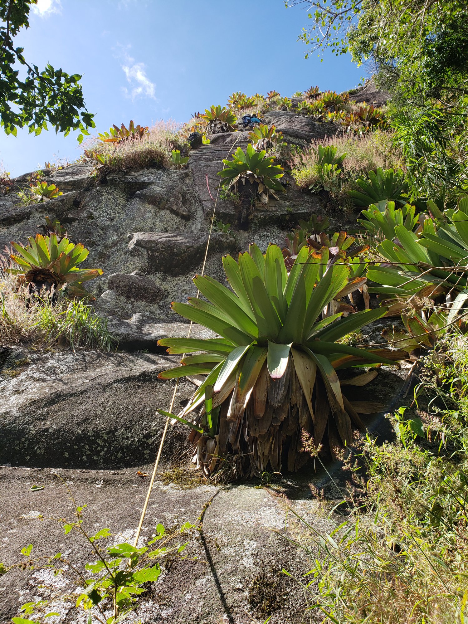 Após perder quase uma hora procurando o melhor lugar para parar, deixamos o carro numa beira apertada de estrada de terra e começamos a trilha. Nos perdemos um pouco na trilha, já que não tínhamos muitas informações a respeito dela, mas chegamos na base da via por volta das 10h30). A via Bode da Tarde (4 IV E2) é uma boa introdução para a região mesmo. Tranquila, mas já com alguns lances de proteções distantes e um bonito caminho, com muitas bromélias (não sei se esse termo seria o mais correto) e uma linda vista dos Três Picos e dos vales.