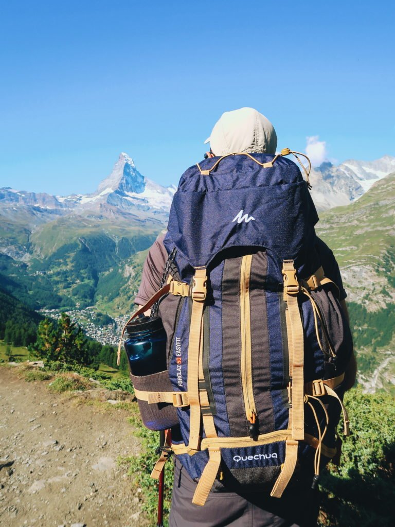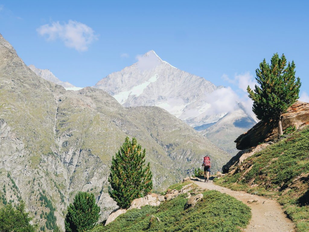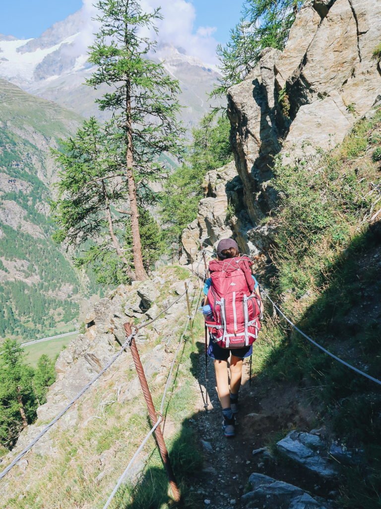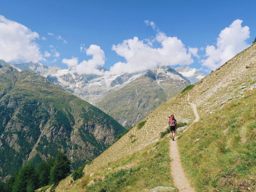 Era finalmente hora de começar. Terminamos o café da manhã, saímos do hostel, tomamos o rumo da trilha (que era bem ao lado do hostel) e começamos a caminhada rumo a Cabana Europa Hut, nosso objetivo do dia. Seriam em torno de vinte quilômetros. O início foi puxado, pois, tivemos que subir da base do vale de Mattertal até a trilha Europaweg. Essa trilha liga as cidades de Zermatt e Grächen pelo alto das montanhas.
