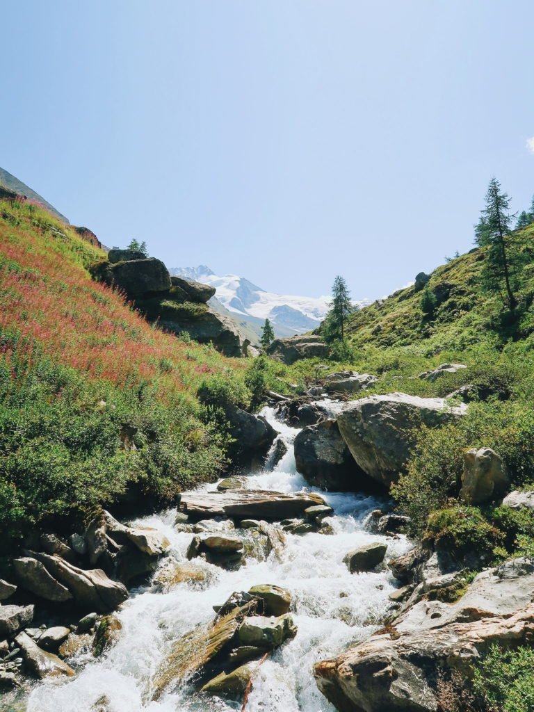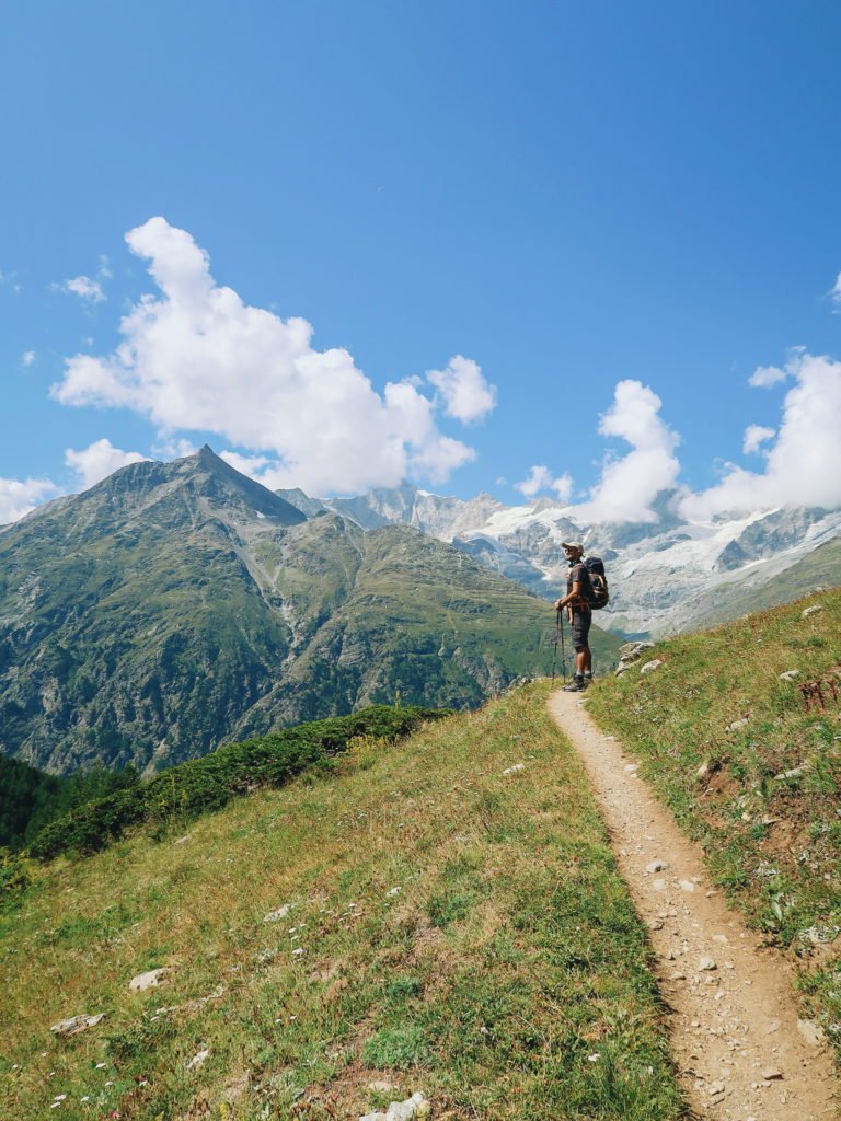 A partir dali, foram quilômetros de trilhas. No começo mais planas e largas, dando lugar mais para frente a trechos mais ondulados e irregulares. Avançamos bem nesse primeiro trecho que terminaria em Täschalp. Isso foi por volta do meio-dia. Nessa parte, a quantidade de pessoas na trilha era bem menor. Agora só víamos quem realmente estava no trekking ou buscando mais aventuras.
