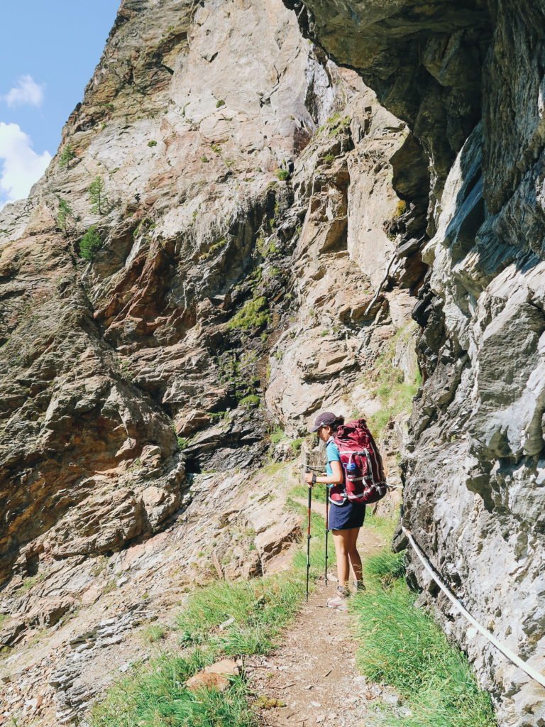 A partir de Täschalp, a trilha começou a ficar perigosa, mais estreita, com mais áreas de risco e desfiladeiros de tirar o fôlego (bem clichê, mas é a melhor forma que encontrei pra explicar). Um erro e a queda poderia ser fatal (clichê de novo, mas...). Continuamos com muito cuidado. Um grande pedaço da trilha tinha cordas de proteção e em alguns lugares específicos tinham correntes presas na rocha para dar maior suporte e segurança.
